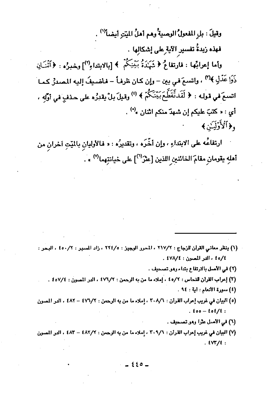 وأما إعرابُها: فارتفاع (شهادة بينكم) [بالابتداء] وخبره: (اثنان