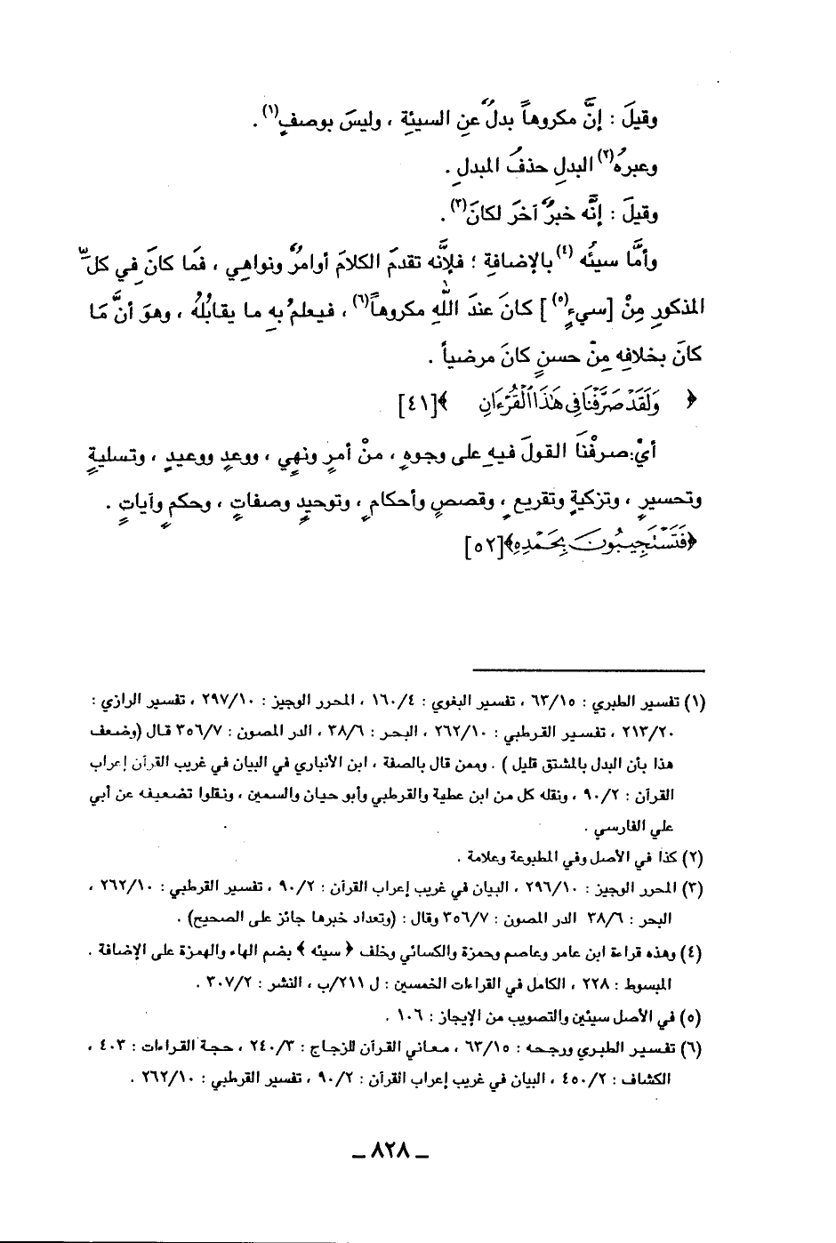 وأما سيئه بالإضافة، فلإنه تقدم الكلام أوامر ونواهي، فما كان في كل المذكور من [سيء] كان عند الله مكروهاً، فيعلم به ما يقابله، وهو أن ما كان بخلافه من حسن كان مرضياً.