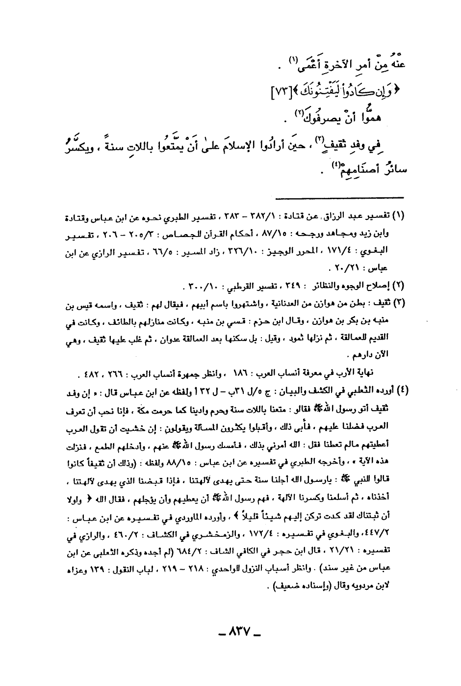 في وفد ثقيف، حين أرادوا الإسلام على أن يمتعوا باللات سنة، ويكسر سائر أصنامهم.