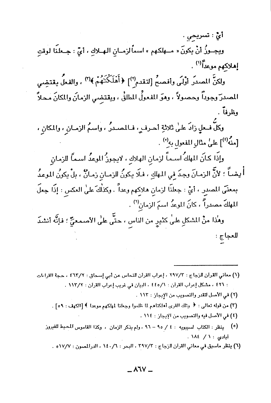 وإذا كان المهلك اسماً لزمان الهلاك، لا يجوز الموعد اسماً للزمان أيضاً، لأن الزمان وجد في المهلك، فلا يكون للزمان زمان، بل يكون الموعد بمعنى المصدر، أي: جعلنا لزمان هلاكهم وعداً، وكذلك على العكس: إذا جعل المهلك مصدراً، كان الموعد اسم الزمان.