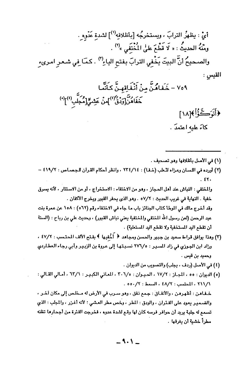 والصحيح أن البيت يخفي التراب بفتح الياء، كما في شعر امرئ القيس: