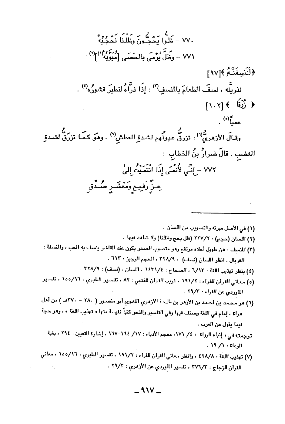 وقال الأزهري: تزرق عيونهم لشدة العطش، وهو كما تزرق لشدة الغضب. قال ضرار بن الخطاب: