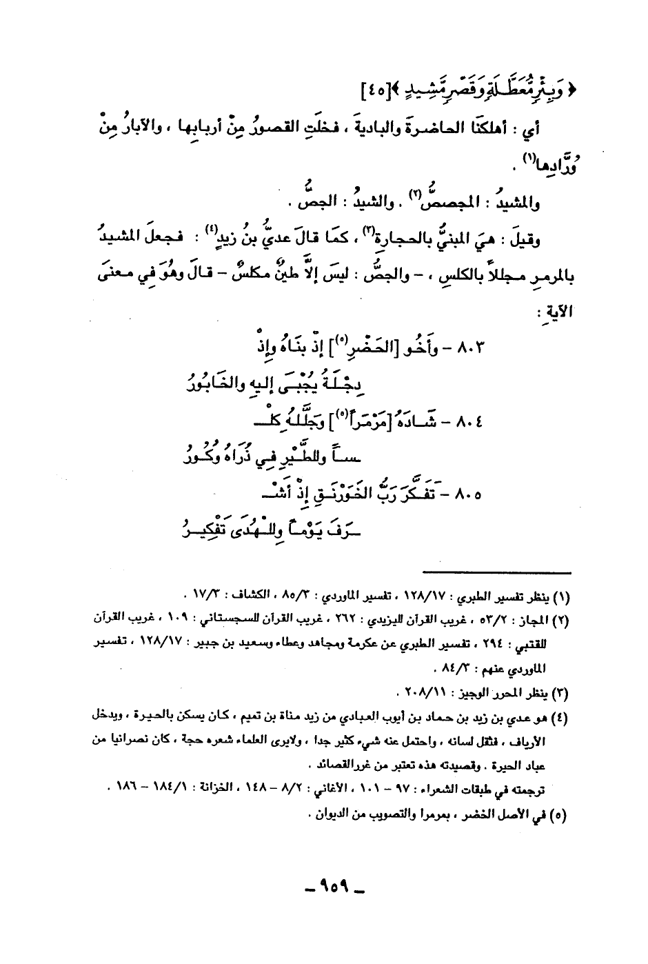 وقيل: هي المبني بالحجارة، كما قال عدي بن زيد: فجعل المشيد بالمرمر مجللاً بالكلس، -والجص: ليس إلا طين مكلس- قال وهو في معنى الآية: