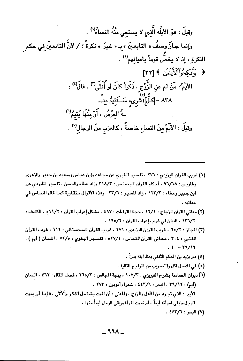 838 - [كل] امرئ ستئيم منـ ... ـه العرس، أو منها يئيم. وقيل: الأيم من النساء خاصة، كالعزب من الرجال.
