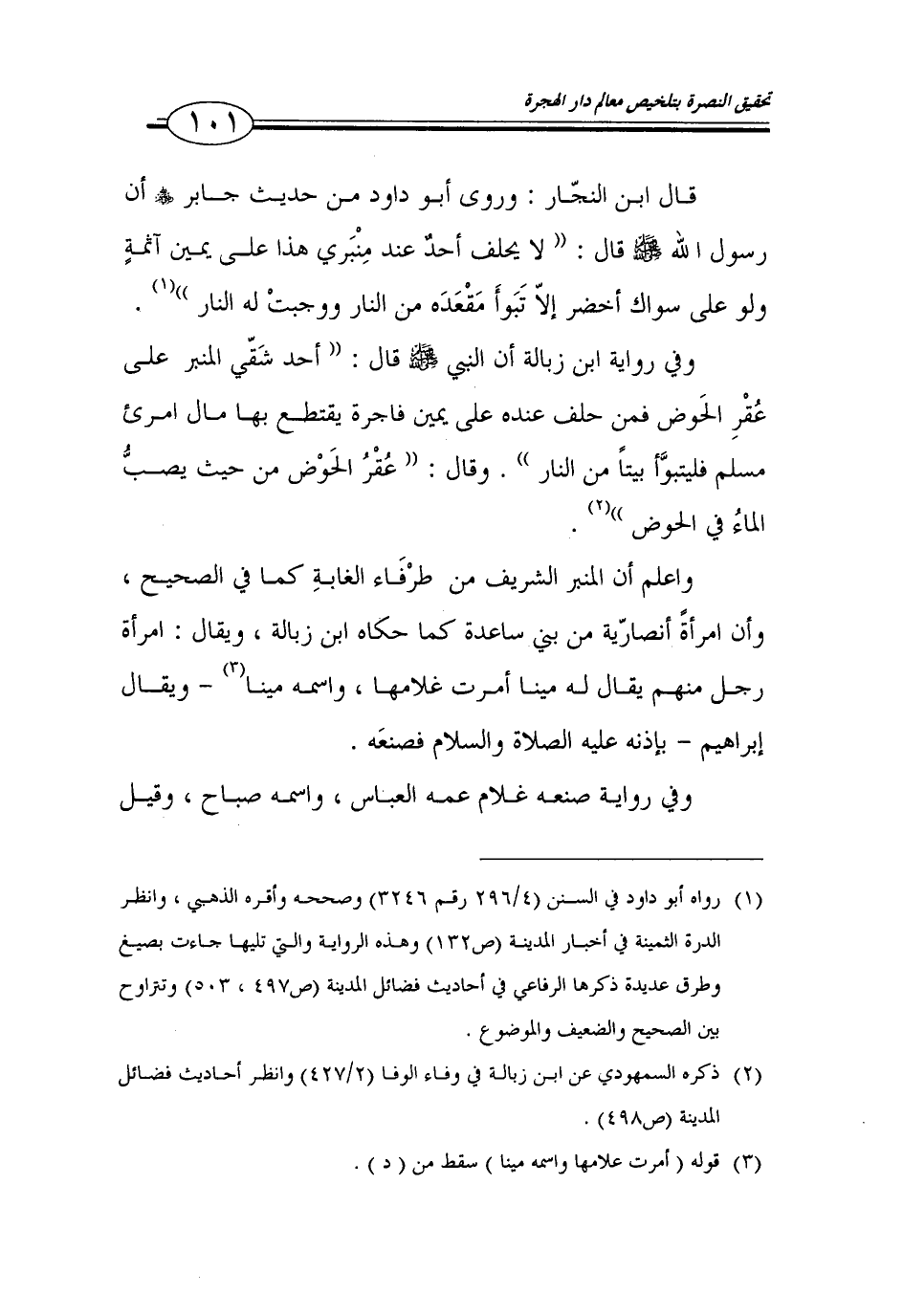 101…قال ابن النجار: وروى أبو داود من حديث جابر أن رسول الله صلى الله عليه وسلم قال: (لا يحلف أحد عند منبري هذا على يمين آثمة ولو على سواك أخضر الا تبوأ مقعده من النار ووجبت له النار) (1).
