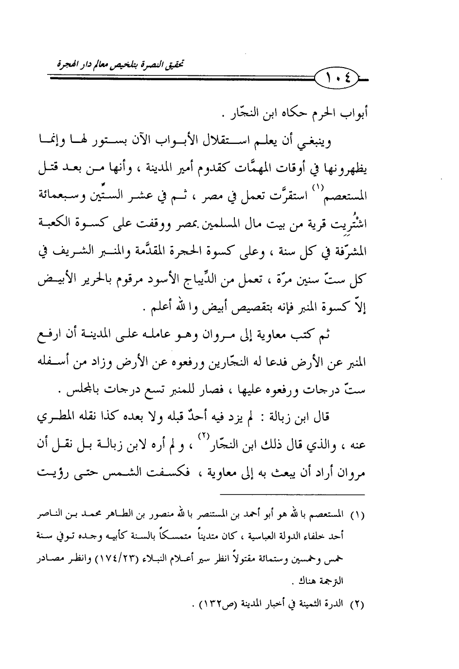 وينبغي أن يعلم استقلال الأبواب الآن بستور لها وانما يظهرونها في أوقات المهمات كقدوم أمير المدينة، وأنها من بعد قتل المستعصم (1) استقرت تعمل في مصر، ثم في عشر الستين وسبعمائة اشتريت قرية من بيت مال المسلمين بمصر ووقفت على كسوة الكعبة المشرفة في كل سنة، وعلى كسوة الحجرة المقدمة والمنبر الشريف في كل ست سنين مرة، تعمل من الديباج الأسود مرقوم بالحرير الأبيض الا كسوة المنبر فانه بتقصيص أبيض والله أعلم.