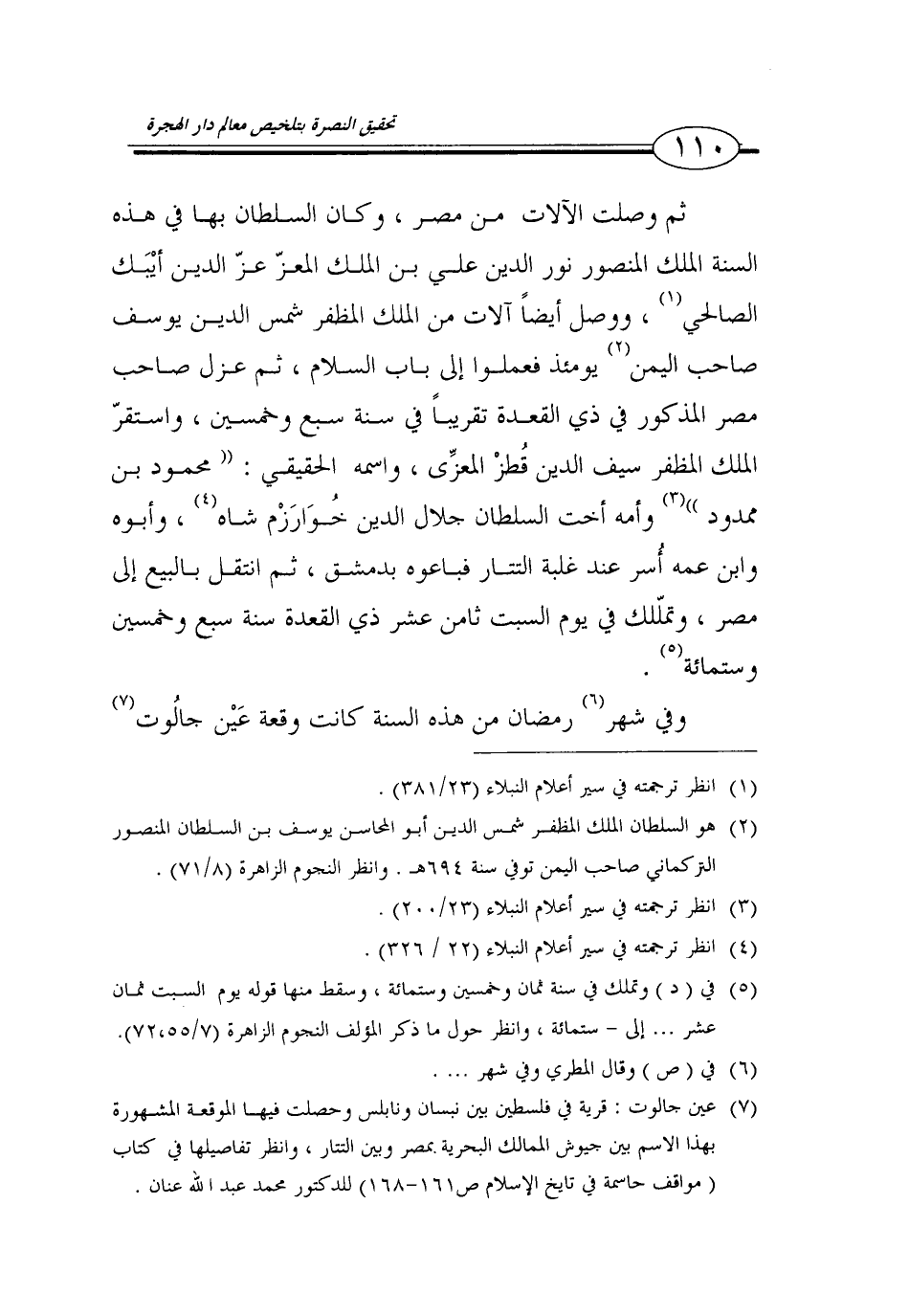 (7) عين جالوت: قرية في فلسطين بين نيسان ونابلس وحصلت فيها الموقعة المشهورة بهذا الاسم بين جيوش الممالك البحرية بمصر وبين التتار، وانظر تفاصيلها في كتاب (مواقف حاسمة في تاريخ الاسلام ص 161 - 168) للدكتور محمد عبد الله عنان.