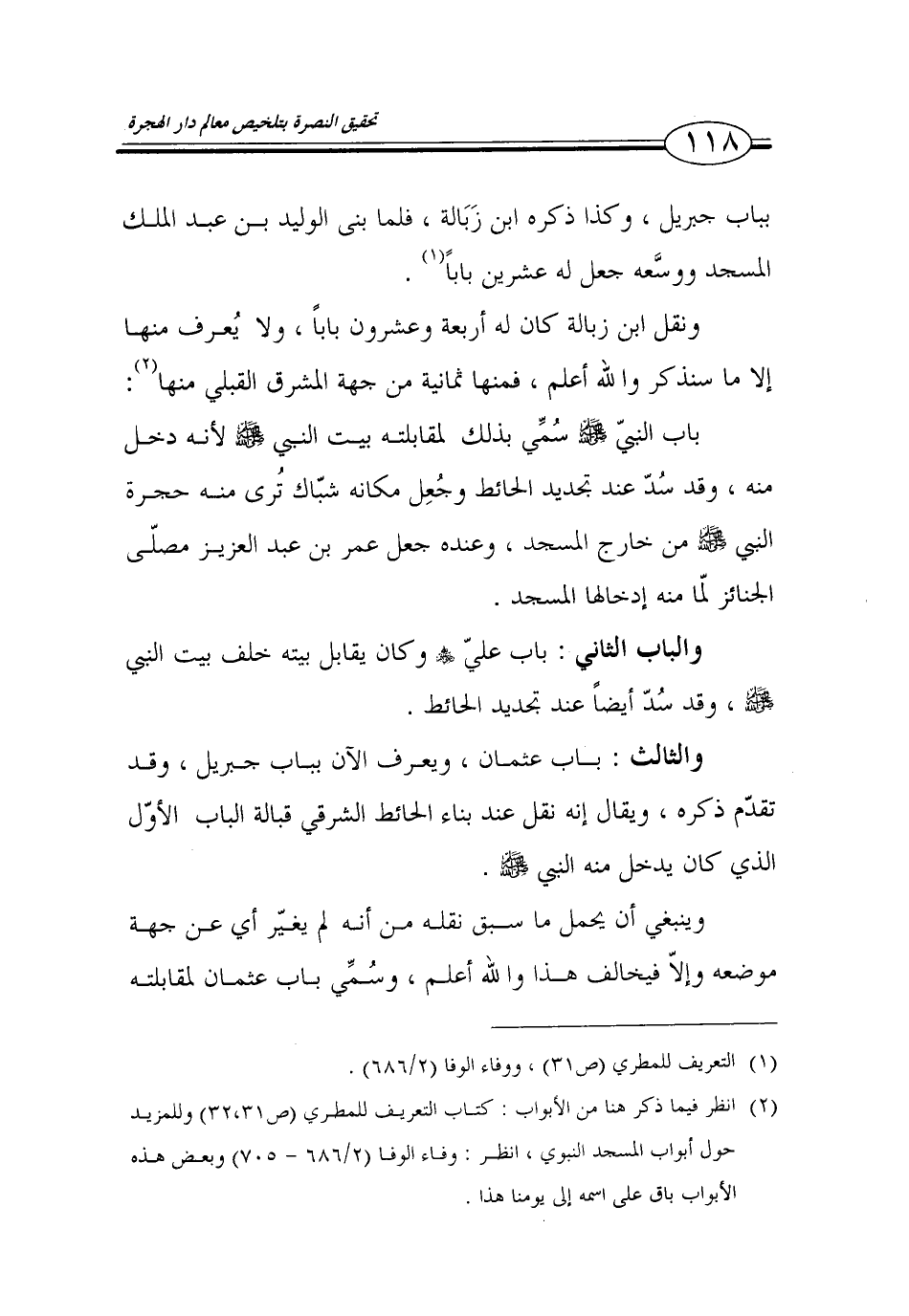 (2) انظر فيما ذكر هنا من الأبواب: كتاب التعريف للمطري (ص 31، 32) وللمزيد حول أبواب المسجد النبوي، انظر: وفاء الوفا (2/ 686 - 705) وبعض هذه الأبواب باق على اسمه إلى يومنا هذا.