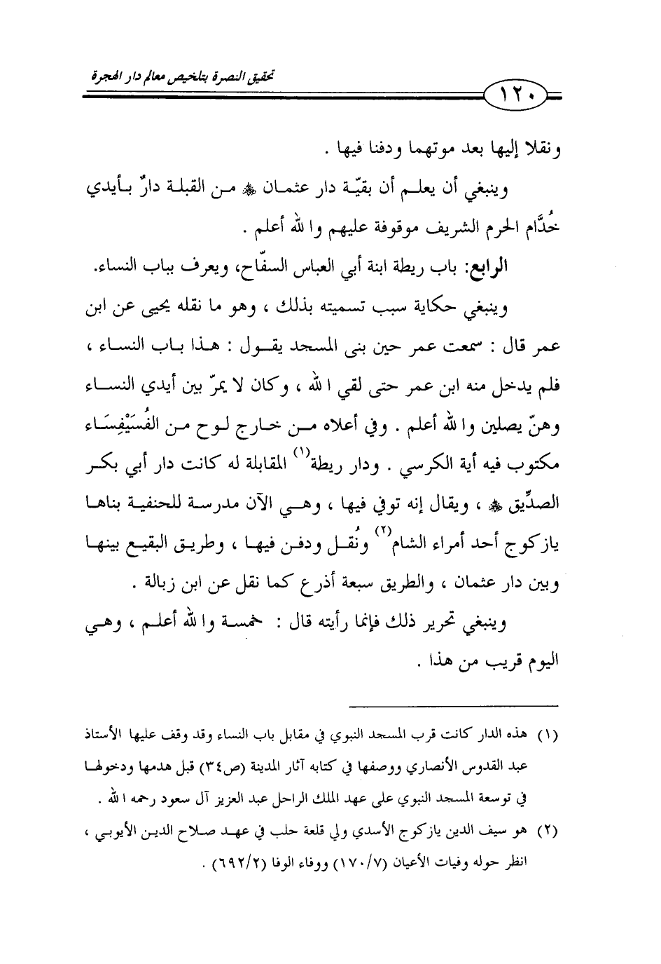 (1) هذه الدار كانت قرب المسجد النبوي في مقابل باب النساء وقد وقف عليها الأستاذ عبد القدوس الأنصاري ووصفها في كتابه آثار المدينة (ص34) قبل هدمها ودخولها في توسعة المسجد النبوي على عهد الملك الراحل عبد العزيز آل سعود رحمه الله.