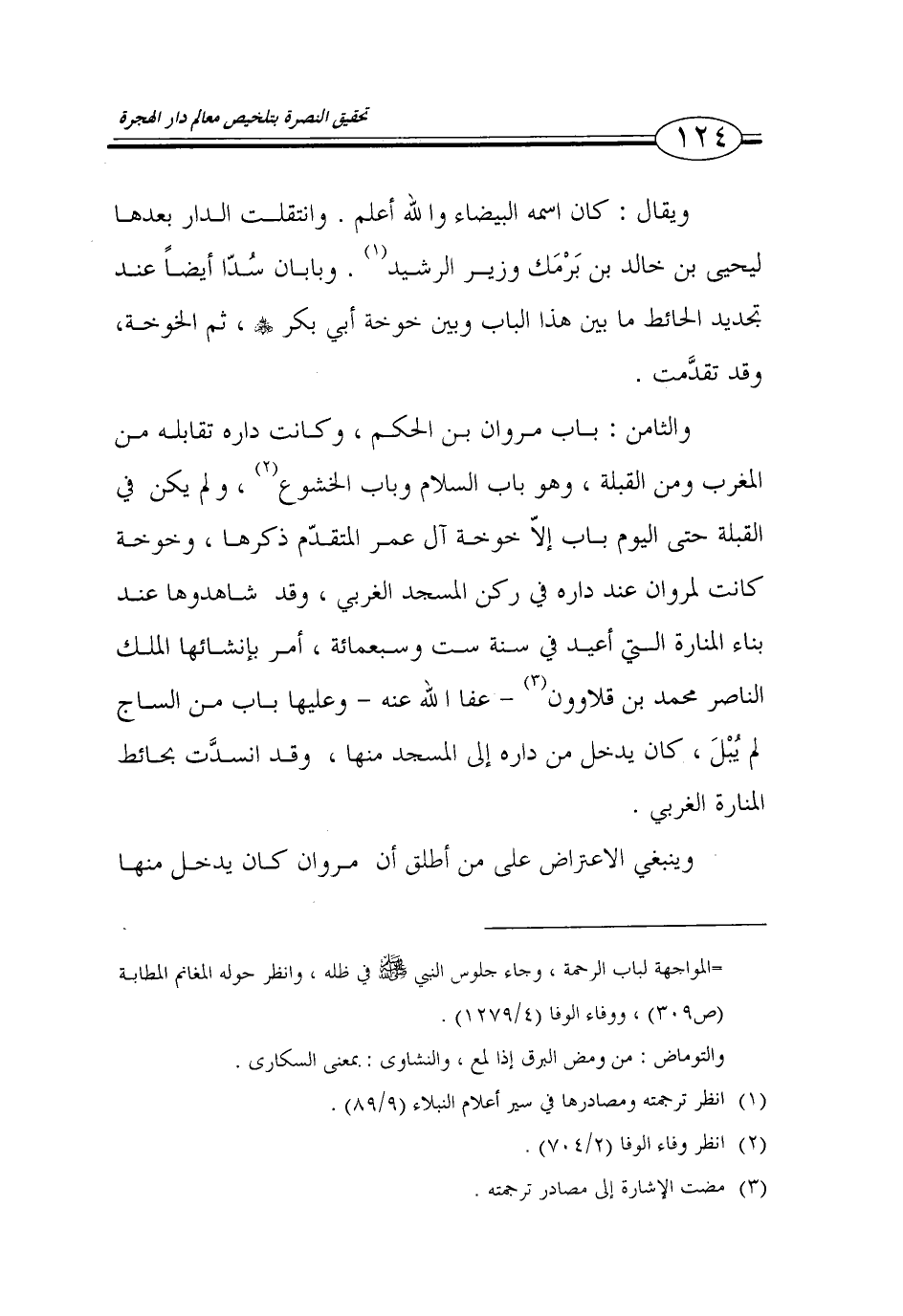 والثامن: باب مروان بن الحكم، وكانت داره تقابله من المغرب ومن القبلة، وهو باب السلام وباب الخشوع (2)، ولم يكن في القبلة حتى اليوم باب الا خوخة آل عمر المتقدم ذكرها، وخوخة كانت لمروان عند داره في ركن المسجد الغربي، وقد شاهدوها عند بناء المنارة التي أعيد في سنة ست وسبعمائة، أمر بانشائها الملك الناصر محمد بن قلاوون (3) - عفا الله عنه - وعليها باب من الساج لم يبل، كان يدخل من داره إلى المسجد منها، وقد انسدت بحائط المنارة الغربي.
