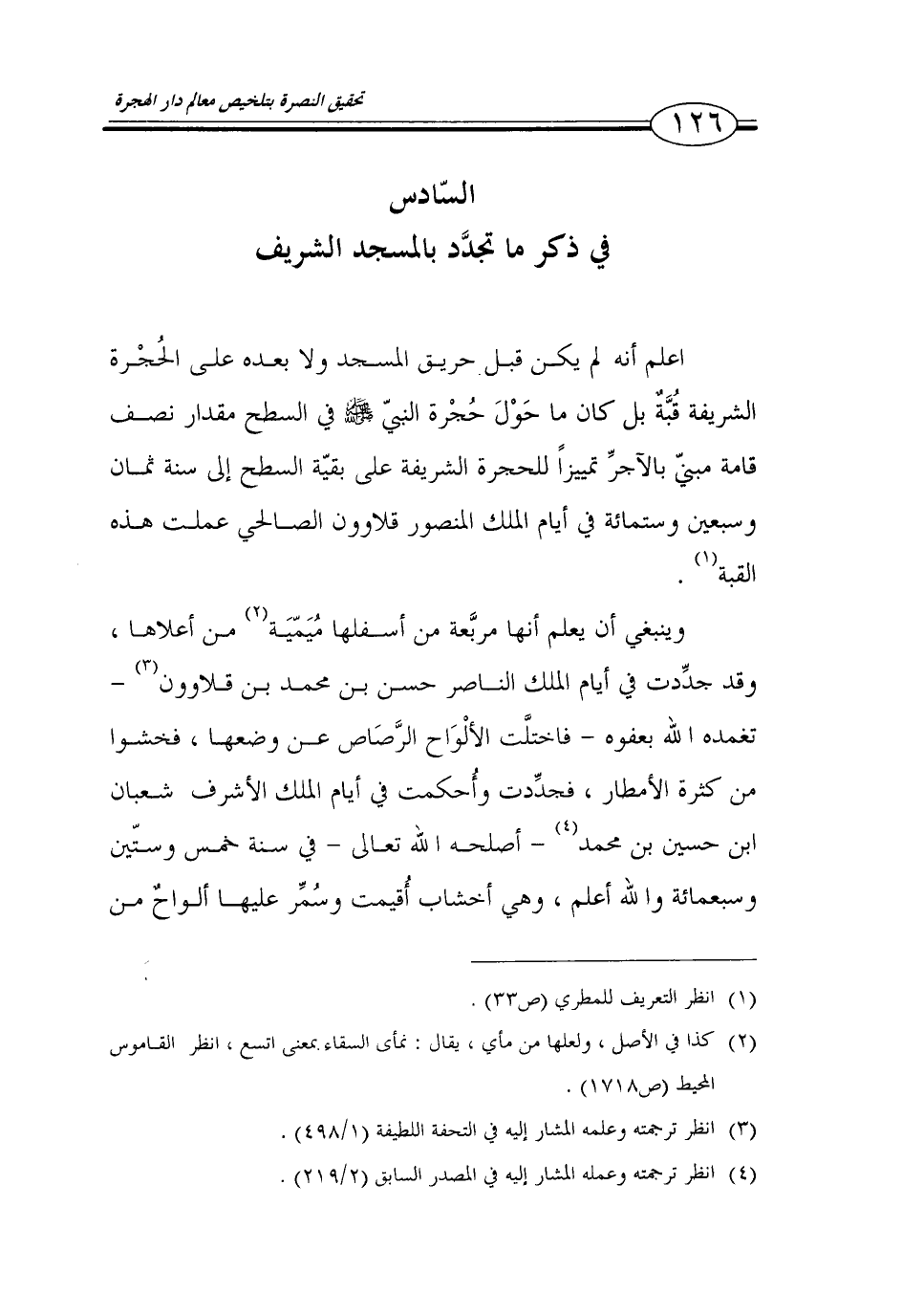 السادس في ذكر ما تجدد بالمسجد الشريف اعلم أنه لم يكن قبل حريق المسجد ولا بعده على الحجرة الشريفة قبة بل كان ما حول حجرة النبي صلى الله عليه وسلم في السطح مقدار نصف قامة مبني بالآجر تمييزاً للحجرة الشريفة على بقية السطح إلى سنة ثمان وسبعين وستمائة في أيام الملك المنصور قلاوون الصالحي عملت هذه القبة (1).