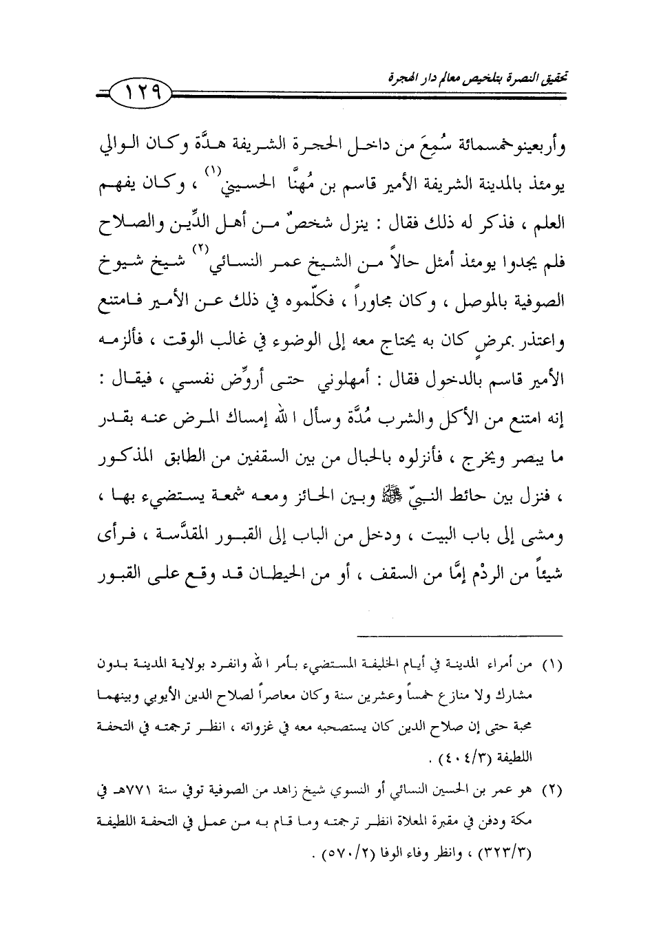129…وأربعين وخمسمائة سمع من داخل الحجرة الشريفة هدة وكان الوالي يومئذ بالمدينة الشريفة الأمير قاسم بن مهنا الحسيني (1)، وكان يفهم العلم، فذكر له ذلك فقال: ينزل شخص من أهل الدين والصلاح فلم يجدوا يومئذ أمثل حالاً من الشيخ عمر النسائي (2) شيخ شيوخ الصوفيه بالموصل، وكان مجاوراً، فكلموه في ذلك عن الأمير فامتنع واعتذر بمرض كان به يحتاج معه إلى الوضوء في غالب الوقت، فألزمه الأمير قاسم بالدخول فقال: أمهلوني حتى أروض نفسي، فيقال: انه امتنع من الأكل والشرب مدة وسأل الله امساك المرض عنه بقدر ما يبصر ويخرج، فأنزلوه بالحبال من بين السقفين من الطابق المذكور، فنزل بين الحائط النبي صلى الله عليه وسلم وبين الحائز ومعه شمعة يستضيء بها، ومشى إلى باب البيت، ودخل من الباب إلى القبور المقدسة، فرأى شيئاً من الردم اما من السقف، أو من الحيطان قد وقع على القبور…