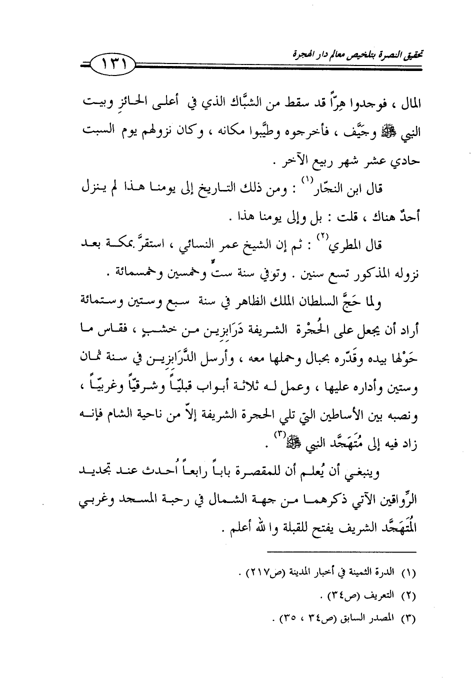 131…المال، فوجدوا هراً قد سقط م الشباك الذي في أعلى الحائز وبيت النبي صلى الله عليه وسلم وجيف، فأخرجوه وطيبوا مكانه، وكان نزولهم يوم السبت حادي عشر شهر ربيع الآخر.