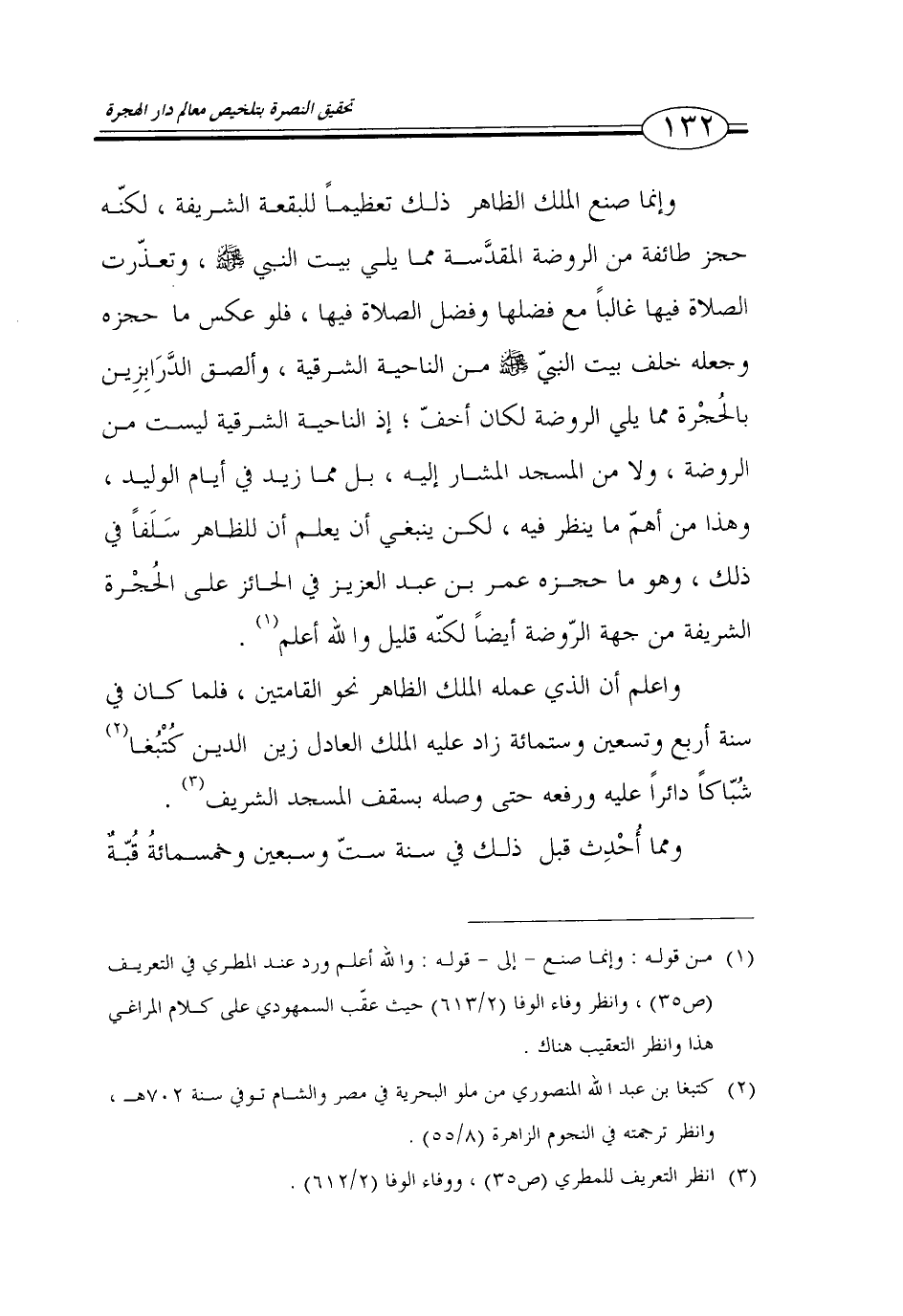 132…انما صنع الملك الظاهر ذلك تعظيماً للبقعة الشريفة، لكنه حجز طائفة من الروضة المقدسة مما يلي بيت النبي صلى الله عليه وسلم، وتعذرت الصلاة فيها غالباً مع فضلها وفضل الصلاة فيها، فلو عكس ما حجزه وجعله خلف بيت النبي صلى الله عليه وسلم من الناحية الشرقية، وألصق الدرابزين بالحجرة مما يلي الروضة لكان أخف؛ اذ الناحية الشرقية ليست من الروضة، ولا من المسجد المشار اليه، بل مما زيد في أيام الوليد، وهذا من أهم ما ينظر فيه، لكن ينبغي أن يعلم أن للظاهر سلفاً في ذلك، وهو ما حجزه عمر بن عبد العزيز في الحائز على الحجرة الشريفة من جهة الروضة أيضاً لكنه قليل والله أعلم (1).