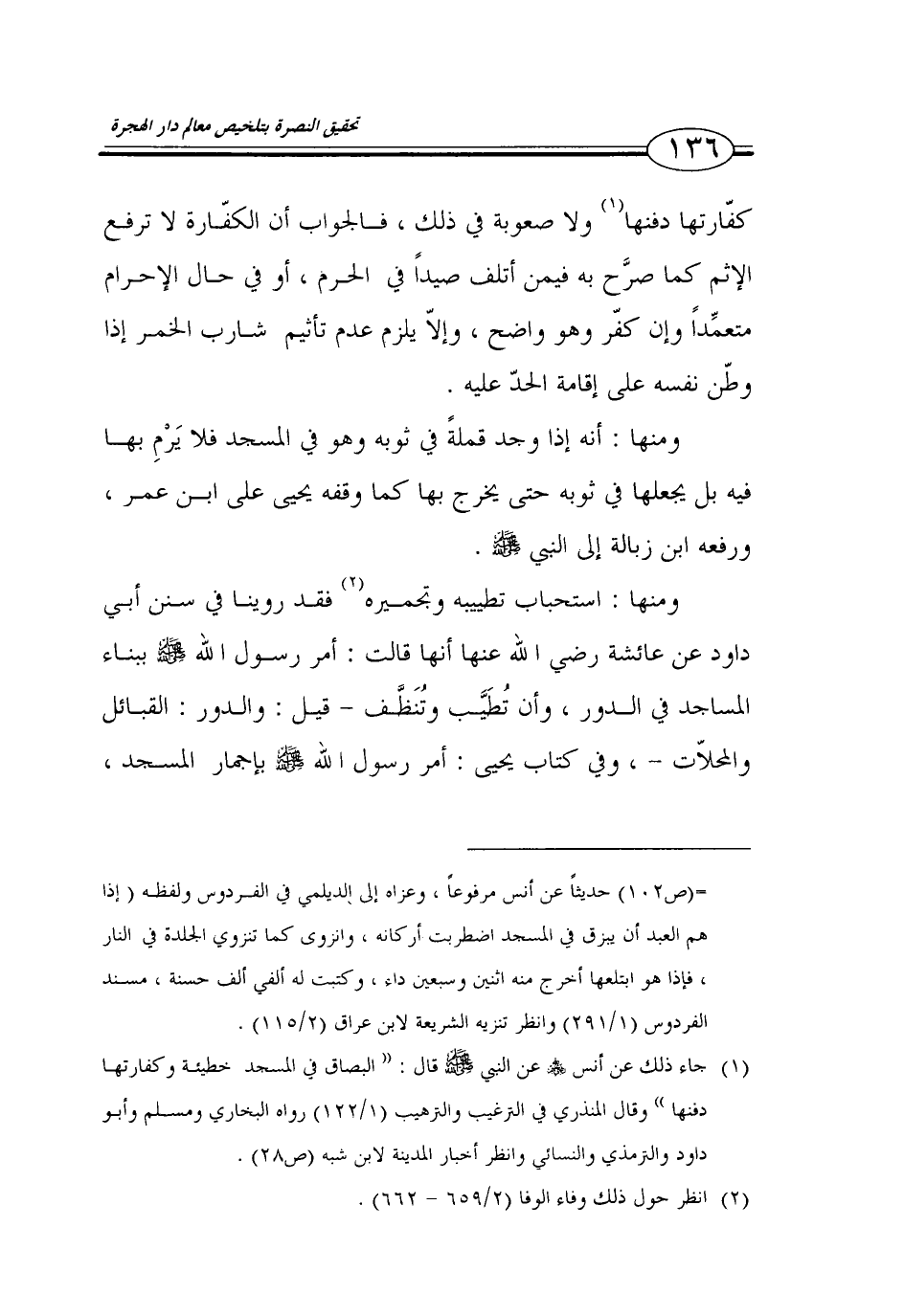 (1) جاء ذلك عن أنس عن النبي صلى الله عليه وسلم قال: (البصاق في المسجد خطيئة وكفارتها دفنها) وقال المنذري في الترغيب والترهيب (1/ 122) رواه البخاري ومسلم وأبو داود والترمذي والنسائي وانظر أخبار المدينة لابن شبه (ص 28).