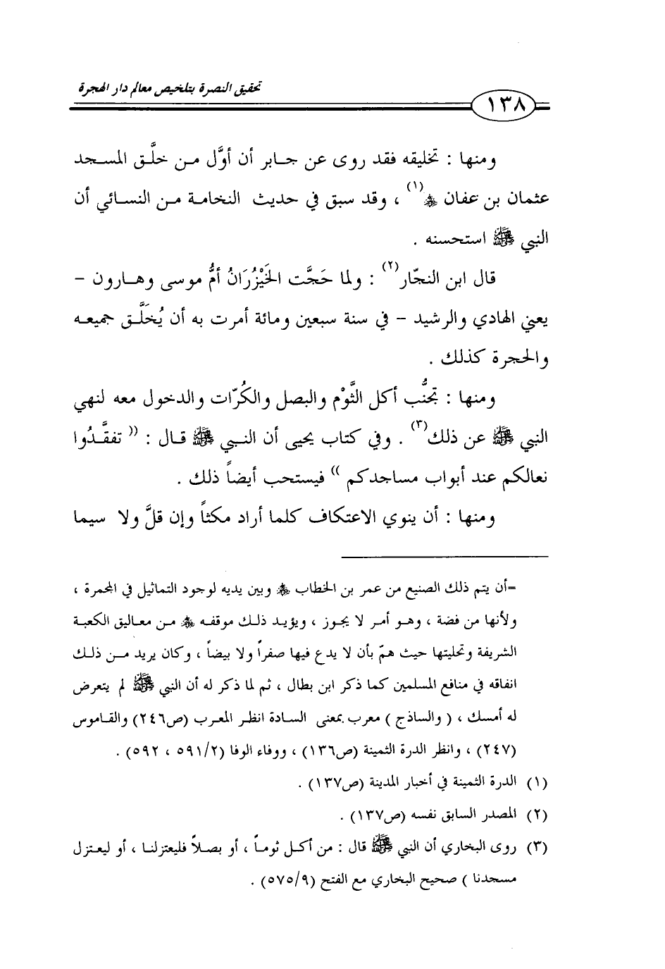 138…ومنها: تخليقه فقد روى عن جابر أن أول من خلق المسجد عثمان بن عفان رضي الله عنه (1)، وقد سبق في حديث النخامة من النسائي أن النبي صلى الله عليه وسلم استحسنه.