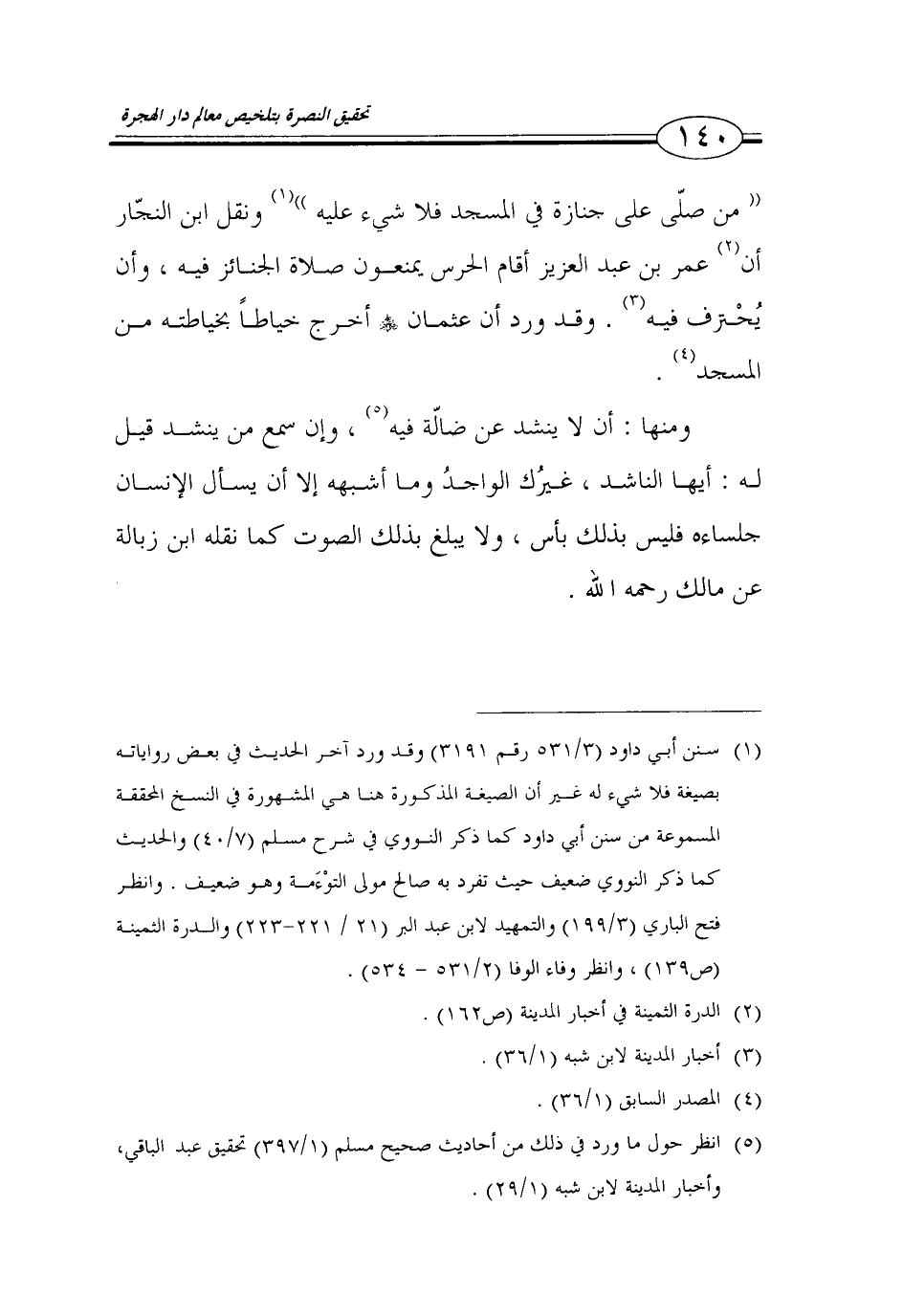 140… (من صلى على جنازة في المسجد فلا شيء عليه) (1) ونقل ابن النجار أن (2) عمر بن عبد العزيز أقام الحرس يمنعون صلاة الجنائز فيه، وأن يحترف فيه (3).