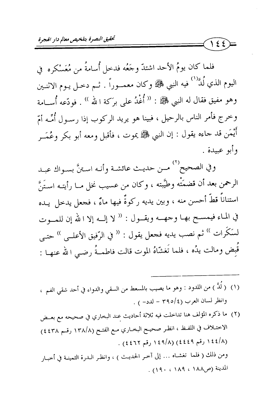 144…فلما كان يوم الأحد اشتد وجعه فدخل أسامة من معسكره في اليوم الذي لد (1) فيه النبي صلى الله عليه وسلم وكان معموراً.