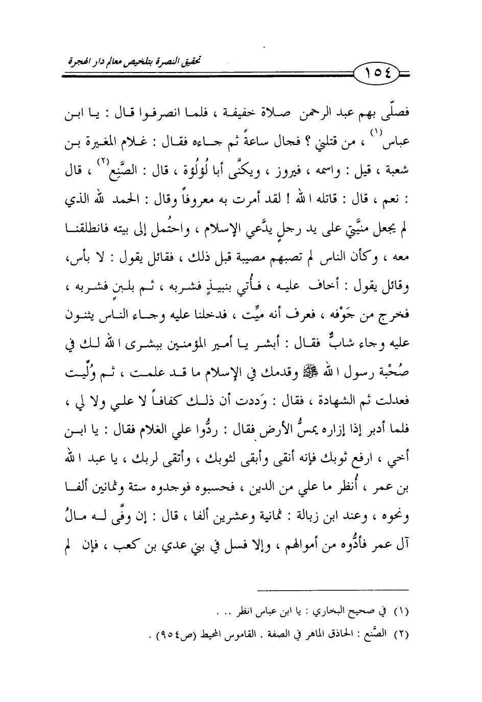 فصلى بهم عبد الرحمن صلاة خفيفة، فلما انصرفوا قال: يا ابن عباس (1)، من قتلني؟ فجال ساعة ثم جاءه فقال: غلام المغيرة بن شعبة، قيل: واسمه، فيروز، ويكنى أبا لؤلؤة، قال: الصنع (2)، قال: نعم، قال: قاتله الله! لقد أمرت به معروفاً وقال: الحمد لله الذي لم يجعل منيتي على يد رجل يدعي الاسلام، واحتمل إلى بيته فانطلقنا معه، وكأن الناس لم تصبهم مصيبة قبل ذلك، فقائل يقول: لا بأس، وقائل يقول: أخاف عليه، فأتي بنبيذ فشربه، ثم بلبن فشربه، فخرج من جوفه، فعرف أنه ميت، فدخنا عليه وجاء الناس يثنون عليه وجاء شاب فقال: أبشر يا أمير المؤمنين ببشرى الله لك في صحبة رسول الله صلى الله عليه وسلم وقدمك في الاسلام ما قد علمت، ثم وليت فعدلت ثم الشهادة، فقال: وددت أن ذلك كفافاً لا علي ولا لي، فلما أدبر اذا ازاره يمس الأرض فقال: ردوا علي الغلام فقال: يا ابن أخي، ارفع ثوبك فانه أنقى وأبقى لثوبك، وأتقى لربك، يا عبد الله بن عمر، أنظر ما علي من الدين، فحسبوه فوجدوه ستة وثمانين ألفا ونحوه، وعند ابن زبالة: ثمانية وعشرين ألفا، قال: ان وفى له مال آل عمر فأدوه من أموالهم، والا فسل في بني عدي بن كعب، فان لم…