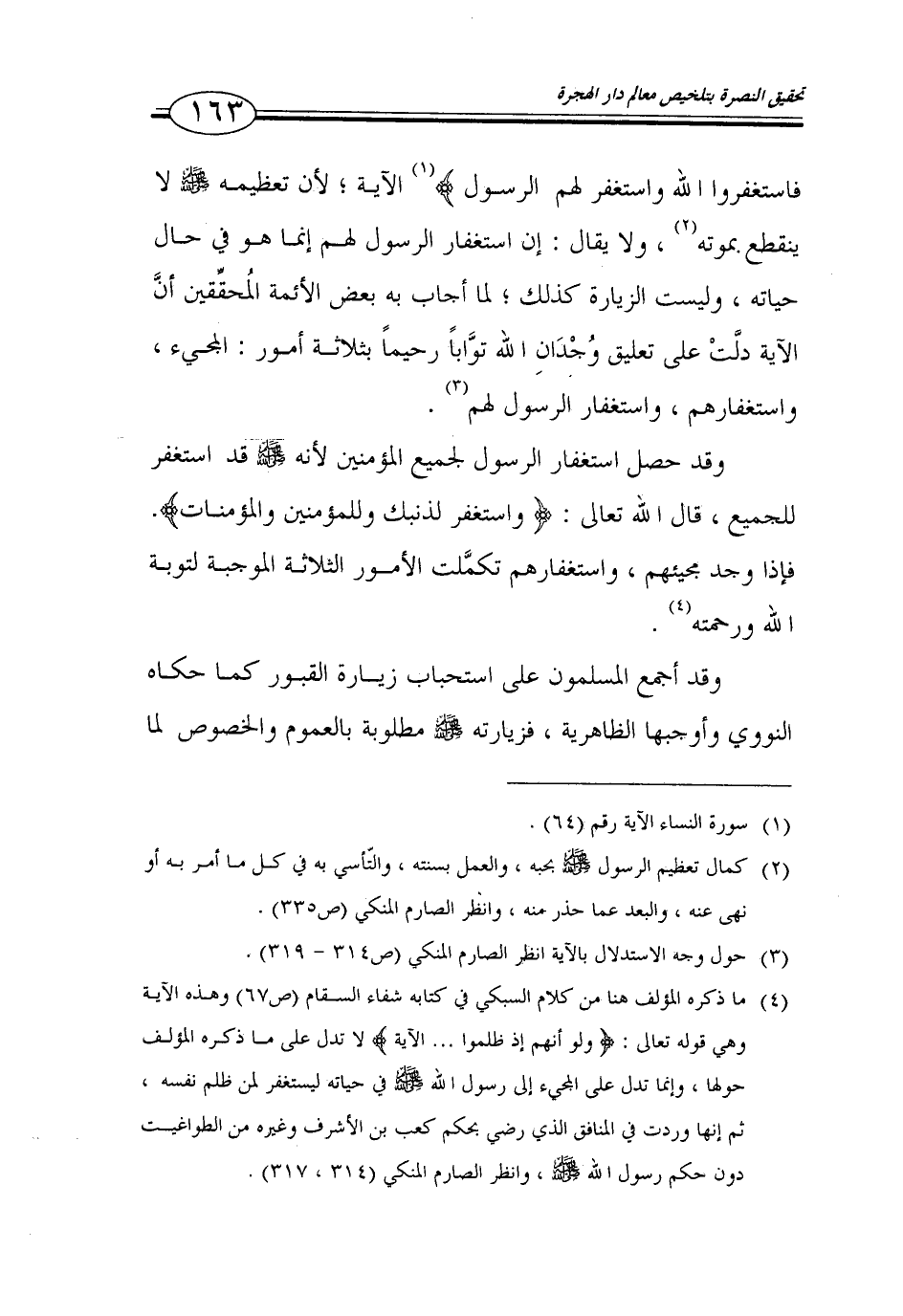 163…فاستغفروا الله واستغفر لهم الرسول) (1) الآية؛ لأن تعظيمه صلى الله عليه وسلم لا ينقطع بموته (2)، ولا يقال: ان استغفار الرسول لهم انما هو في حال حياته، وليست الزيارة كذلك؛ لما أجاب به بعض الأئمة المحققين أن الآية دلت على تعليق وجدان الله توابا رحيما بثلاثة أمور: المجيء، واستغفارهم، واستغفار الرسول لهم (3).