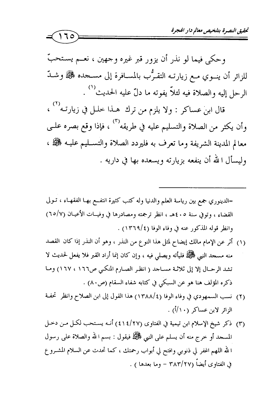 (1) أثر عن الإمام مالك ايضاح لمثل هذا النوع من النذر، وهو أن النذر اذا كان القصد منه مسجد النبي صلى الله عليه وسلم فليأته ويصلي فيه، وان كان انما أراد القبر فلا يفعل لحديث لا تشد الرحال الا إلى ثلاثة مساجد (انظر الصارم المنكي ص 166، 167) وما ذكره المؤلف هنا هو عن السبكي في كتابه شفاء السقام (ص 80).