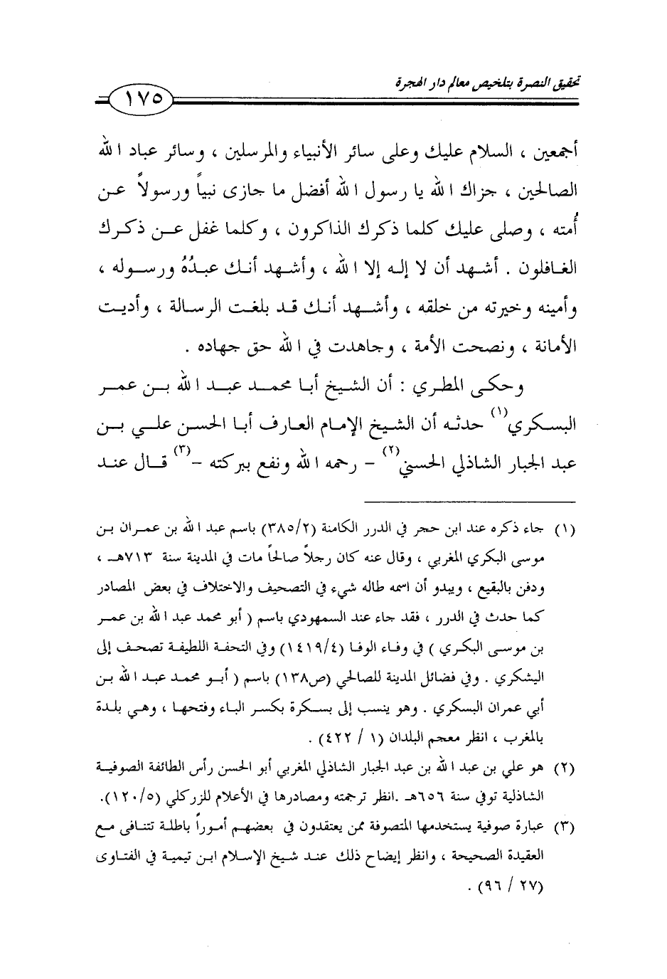 وحكى المطري: ان الشيخ ابا محمد عبد الله بن عمر البسكري (1) حدثه ان الشيخ الإمام العارف ابا الحسن علي بن عبد الجبار الشاذلي الحسني (2) -رحمه الله ونفع ببركته- (3) قال عند…