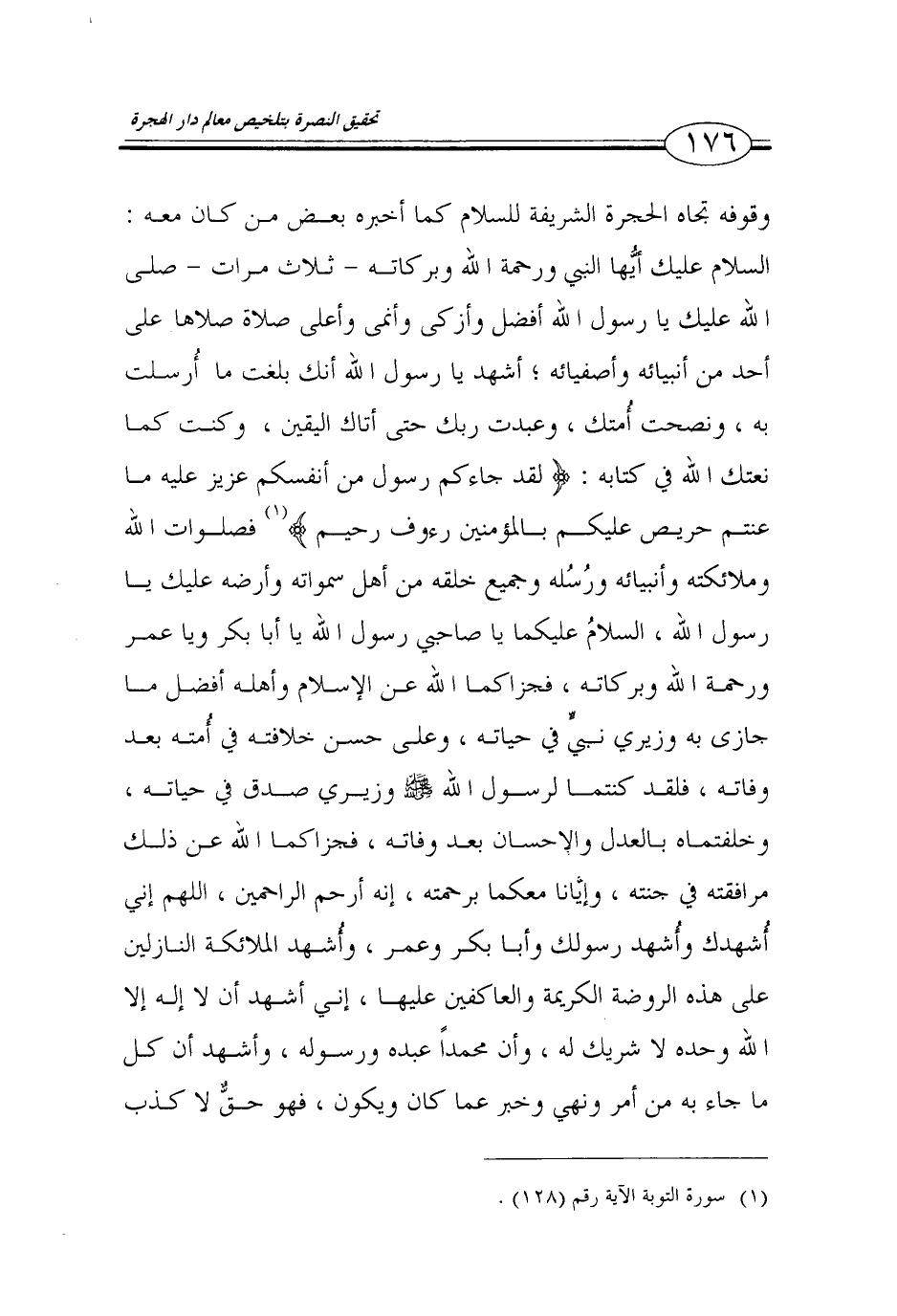 176…وقوفه تجاه الحجرة الشريفة للسلام كما اخبره بعض من كان معه: السلام عليك ايها النبي ورحمة الله وبركاته -ثلاث مرات- صلى الله عليك يا رسول الله افضل وازكى وانمى واعلى صلاة صلاها على احد من انبيائه واصفيائه؛ اشهد يا رسول الله انك بلغت ما ارسلت به، ونصحت امتك، وعبدت ربك حتى اتاك اليقين، وكنت كما نعتك الله في كتابه: ((لقد جاءكم رسول من انفسكم عزيز عليه ما عنتم حريض عليكم بالمؤمنين رءوف رحيم)) (1) فصلوات الله وملائكته وانبيائه ورسله وجميع خلقه من اهل سمواته وارضه عليك يا رسول الله، السلام عليكما يا صاحبي رسول الله يا ابا بكر ويا عمر ورحمة الله وبركاته، فجزاكما الله عن الاسلام واهله افضل ما جازى به وزيري نبي في حياته، وعلى حسن خلافته في امته بعد وفاته، فلقد كنتما لرسول الله صلى الله عليه وسلم وزيري صدق في حياته، وخلفتماه بالعدل والاحسان بعد وفاته، فجزاكما الله عن ذلك مرافقته في جنته، وايانا معكما برحمته، انه ارحم الراحمين، اللهم اني اشهدك واشهد رسولك وابا بكر وعمر، واشهد الملائكة النازلين على هذه الروضة الكريمة والعاكفين عليها، اني اشهد ان لا اله الا الله وحده لا شريك له، وان محمدا عبده ورسوله، واشهد ان كل ما جاء به من امر ونهي وخبر عما كان ويكون، فهو حق لا كذب…