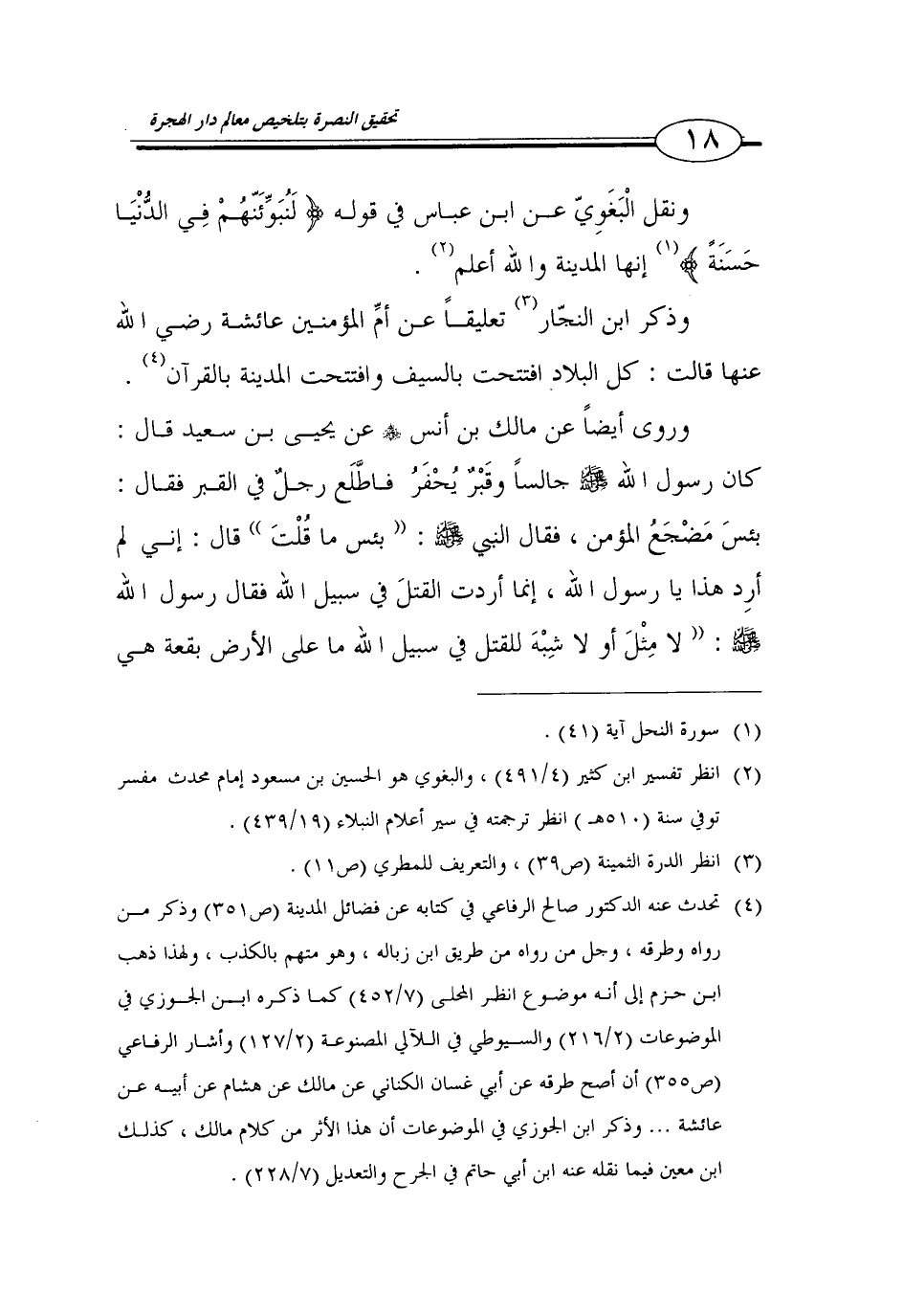 ونقل البغوي عن ابن عباس في قوله (لنبوئنهم في الدنيا حسنة) (1) انها المدينة والله أعلم (2).