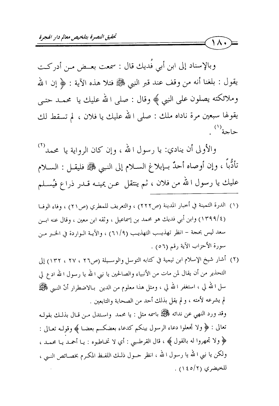 (1) الدرة الثمينة في أخبار المدينة (ص222)، والترعيف للمطري (ص21)، وفاء الوفاء (1399/ 4) وابن أبي فديك هو محمد بن اسماعيل، وثقه ابن معين، وقال عنه ابن سعد ليس بحجة -انظر تهذيب التهذيب (61/ 9)، والاية الواردة في الخبر من سورة الاحزاب الاية رقم (56).