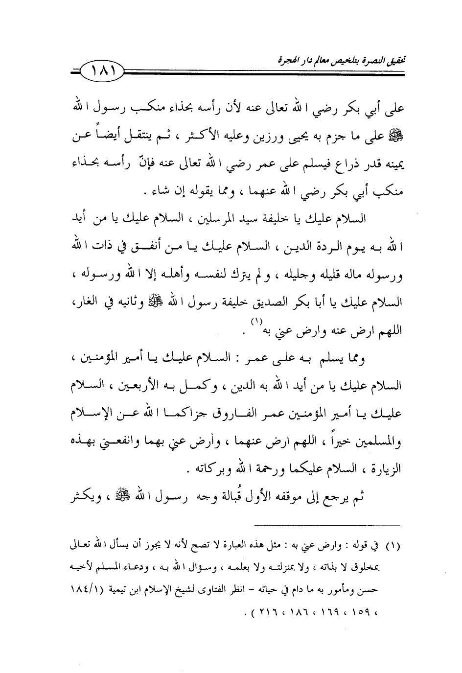 181…على أبي بكر رضي الله تعالى عنه لان راسه بحذاء منكب رسول الله صلى الله عليه وسلم على ما جزم به يحيى ورزين وعليه الاكثر، ثم ينتقل ايضا عن يمينه قدر ذراع فيسلم على عمر رضي الله تعالى عنه فان راسه بحذاء منكب أبي بكر رضي الله عنهما، ومما يقوله ان شاء.
