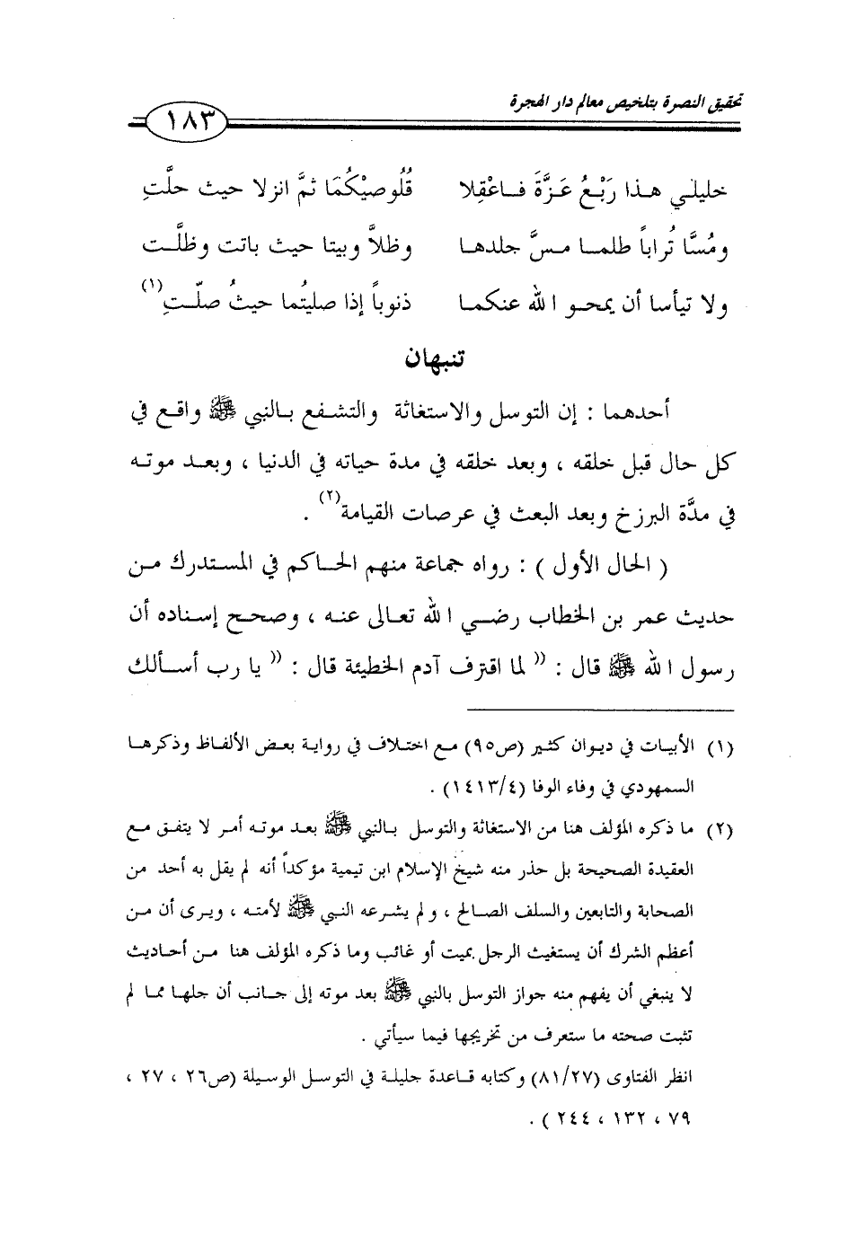 183…خليلي هذا ربع عزة فاعقلا قلوصيكما ثم انزلا حيث حلت ومسا ترابا طلما مس جلدها وظلا وبيتا حيث باتت وظلت ولا تياسا ان يمحو الله عنكما ذنوبا اذا صليتما حيث صلت (1) تنبهان احدهما: ان التوسل والاستغاثة والتشفع بالنبي صلى الله عليه وسلم واقع في كل حال قبل خلقه، وبعد خلقه في مدة حياته في الدنيا، وبعد موته في مدة البرزخ وبعد البعث في عرصات القيامة (2).