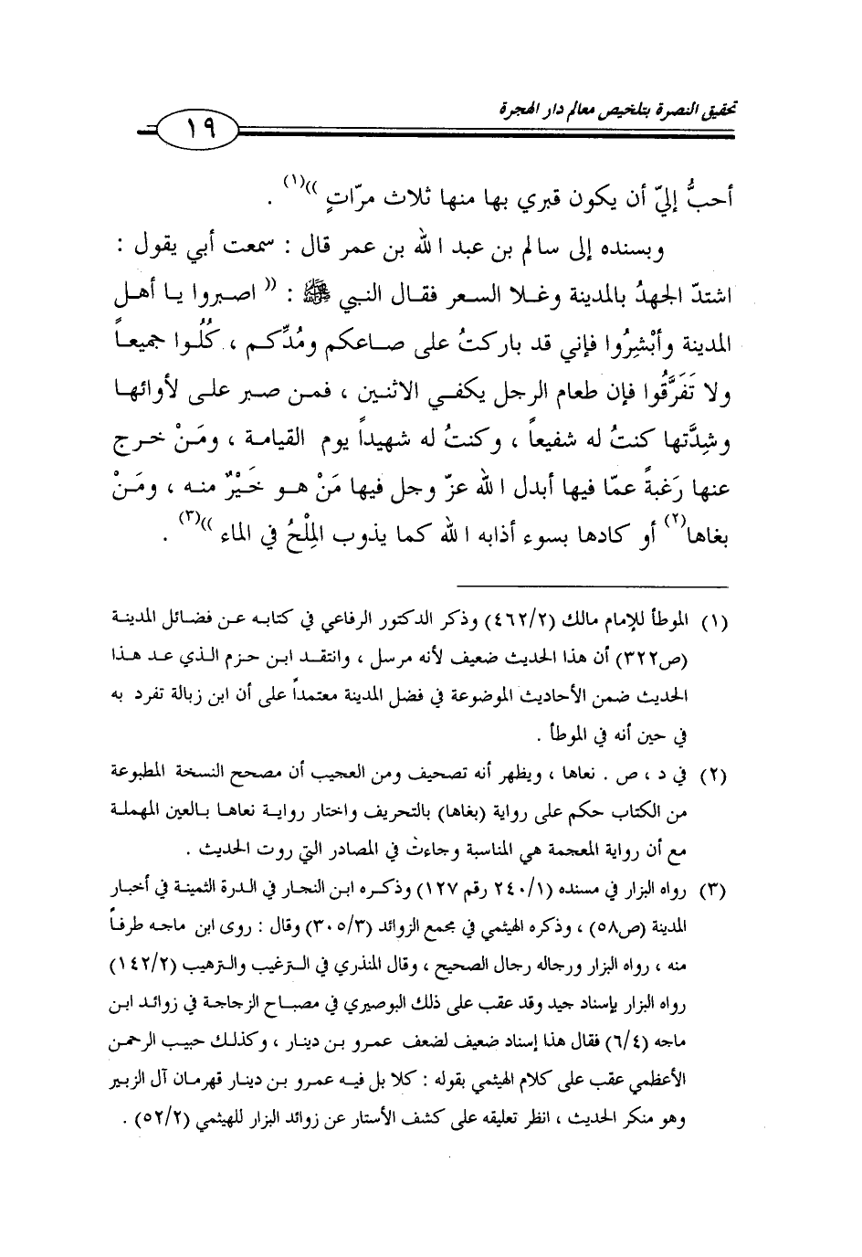 (1) الموطأ للامام مالك (2/ 462) وذكر الدكتور الرفاعي في كتابه عن فضائل المدينة (ص 322) أن هذا الحديث ضعيف لأنه مرسل، وانتقد ابن حزم الذي عد هذا الحديث ضمن الأحاديث الموضوعة في فضل المدينة معتمداً على أن ابن زبالة تفرد به في حين أنه في الموطأ.