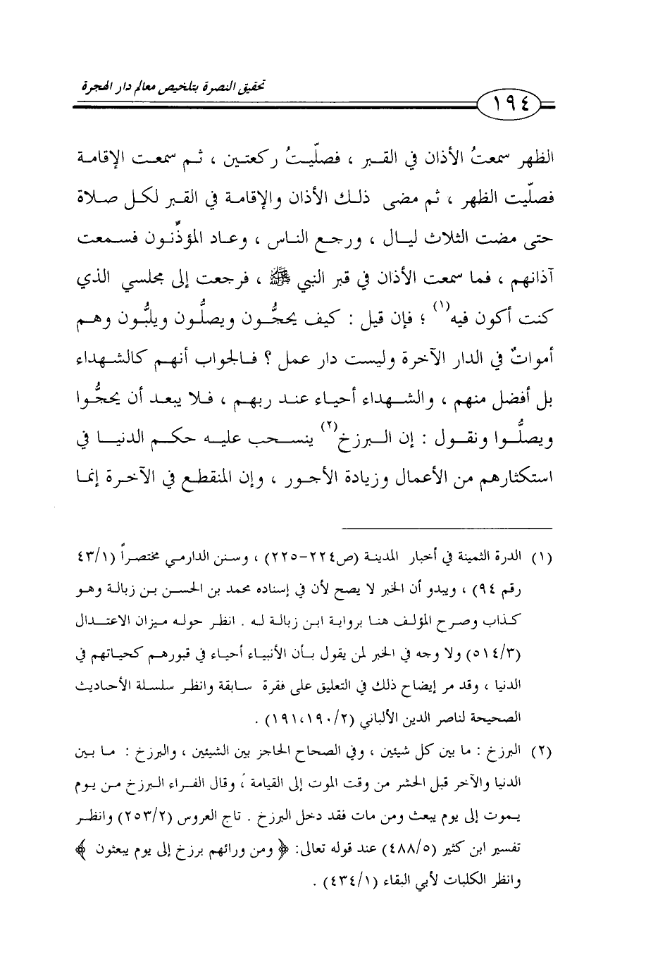 194…الظهر سمعتالأذان في القبر، فصليت ركعتين، ثم سمعت الاقامة فصليت الظهر، ثم مضى ذلك الأذان والاقامة في القبر لكل صلاة حتى مضت الثلاث ليال، ورجع الناس، وعاد المؤذنون فسمعت آذانهم، فما سمعت الأذان في قبر النبي صلى الله عليه وسلم، فرجعت إلى مجلسي الذي كنت أكون فيه (1)؛ فان قيل: كيف يحجون ويصلون ويلبون وهم أموات في الدار الآخرة وليست دار عمل؟ فالجواب أنهم كالشهداء بل أفضل منهم، والشهداء أحياء عند ربهم، فلا يبعد أن يحجوا ويصلوا ونقول: ان البرزخ (2) ينسحب عليه حكم الدنيا في استكثارهم من الأعمال وزيادة الأجور، وان المنقطع في الآخرة انما…