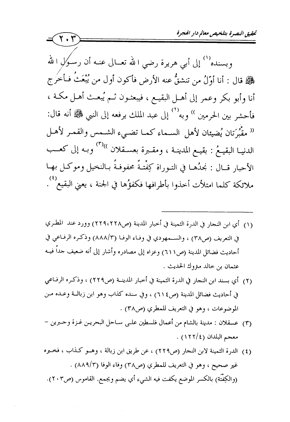 203…وبسنده (1) إلى أبي هريرة رضي الله تعالى عنه أن رسول الله صلى الله عليه وسلم قال: أنا وأول من تنشق عنه الأرض فأكون أول من يبعث فأخرج أنا وأبو بكر وعمر إلى أهل البقيع، فيبعثون ثم يبعث أهل مكة، فأحشر بين الحرمين) وبه (2) إلى عبد الملك يرفعه إلى النبي صلى الله عليه وسلم أنه قال: (مقبرتان يضيئان لأهل السماء كما تضيء الشمس والقمر لأهل الدنيا البقيع: بقيع المدينة، ومقبرة بعسقلان)) (3) وبه إلى كعب الأحبار قال: نجدها في التوراة كفتة محفوفة بالنخيل وموكل بها ملائكة كلما امتلأت أخذوا بأطرافها فكفؤها في الجنة، يعني البقيع (4).