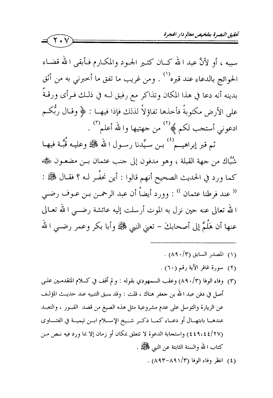 (3) وفاء الوفا (3/ 890) وعقب السمهودي بقوله: ولم أقف في كلام المتقدمين على أصل في دفن عبد الله بن جعفر هناك، قلت: وقد سبق التنبيه عند حديث المؤلف عن الزيارة والتوسل على عدم مشروعية مثل هذه الصيغ من قصد القبور، والتعبد عندها بابتهال أو دعاء كما ذكر شيخ الاسلام ابن تيمية في الفتاوى (27/ 44، 449) واستجابة الدعوة لا تتعلق بمكان أو زمان الا بما ورد فيه نص من كتاب الله والسنة الثابتة عن النبي صلى الله عليه وسلم.