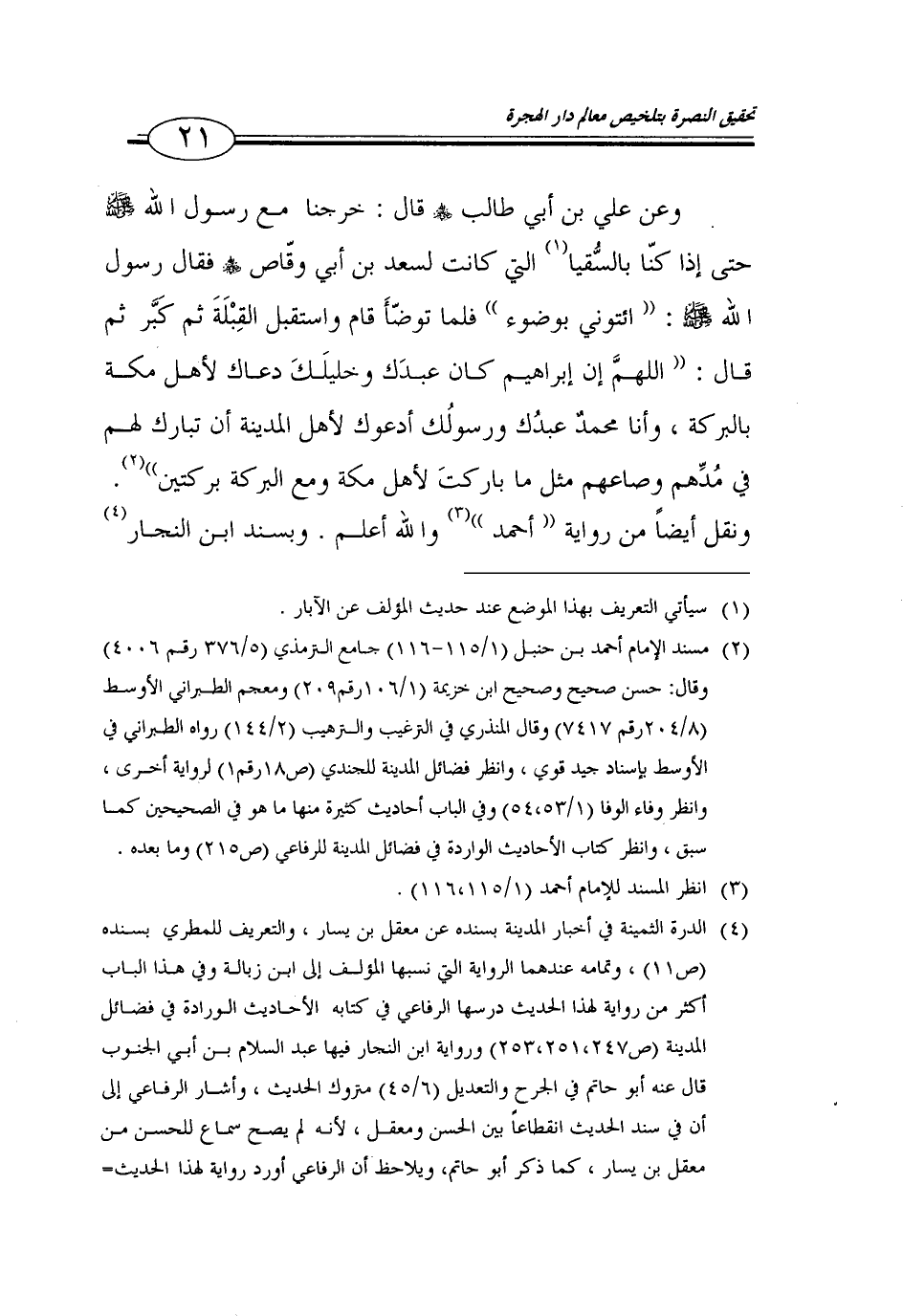 (4) الدرة الثمينة في أخبار المدينة بسنده عن معقل بن يسار، والتعريف للمطري بسنده (ص11)، وتمامه عندهما الرواية التي نسبها المؤلف إلى ابن زبالة وفي هذا الباب اكثر من رواية لهذا الحديث درسها الرفاعي في كتابه الاحاديث الورادة في فضائل المدينة (ص253،251،247) ورواية ابن النجار فيها عبد السلام بن أبي الجنوب قال عنه أبو حاتم في الجرح والتعديل (45/ 6) متروك الحديث، واشار الرفاعي إلى ان في سند الحديث انقطاعا بين الحسن ومعقل، لانه لم يصح سماع للحسن من معقل بن يسار، كما ذكر أبو حاتم، ويلاحظ ان الرفاعي اورد رواية لهذا الحديث =