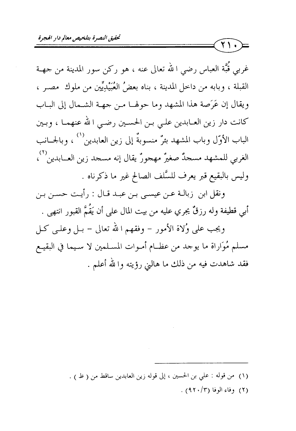 210…غربي قبة العباس رضي الله تعالى عنه، هو ركن سور المدينة من جهة القبلة، وبابه من داخل المدينة، بناه بعض العبيديين من ملوك مصر، ويقال ان عرصة هذا المشهد وما حولها من جهة الشمال إلى الباب كانت دار زين العابدين علي بن الحسين رضي الله عنهما، وبين الباب الأول وباب المشهد بئر منسوبة إلى زين العابدين (1)، وبالجانب الغربي للمشهد مسجد صغير مهجور يقال انه مسجد زين العابدين (2)، وليس بالبقيع قبر يعرف للسلف الصالح غير ما ذكرناه.