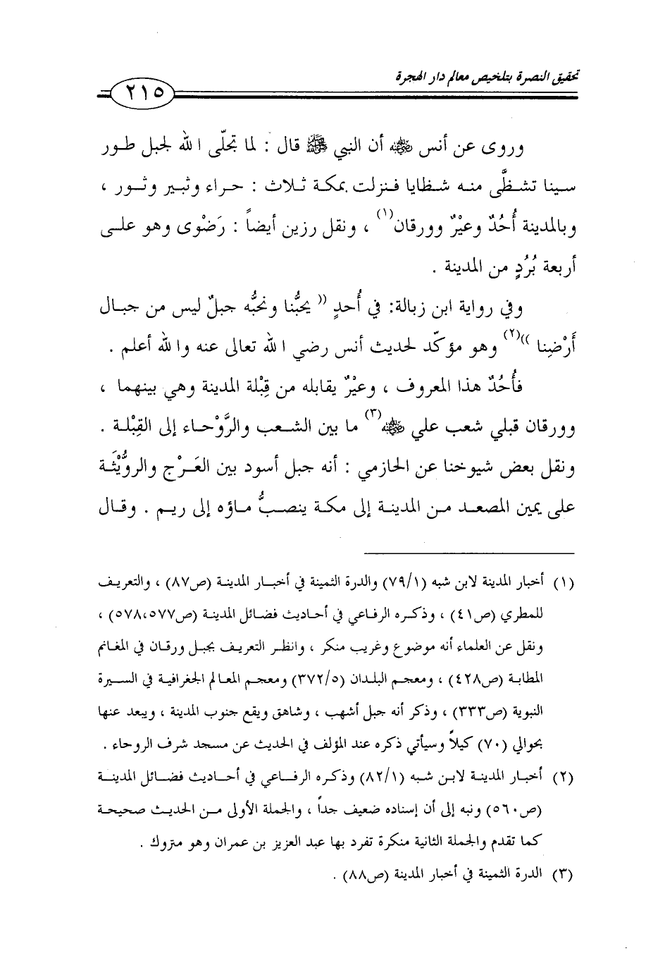 215…وروى عن انس رضي الله عنه ان النبي صلى الله عليه وسلم قال: لما تجلى الله لجبل طور سينا تشظى منه شظايا فنزلت بمكة ثلاث: حراء وثبير وثور، وبالمدينة احد وعير وورقان (1)، ونقل رزين ايضا: رضوى وهو على اربعة برد من المدينة.