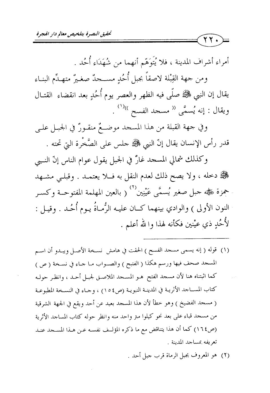 (1) قوله (انه يسمى مسجد الفسح) الحقت في هامش نسخة الاصل ويبدو ان اسم المسجد صحف فيها ورسم هكذا (الفتبح) والصواب ما جاء في نسخة (ص) كما اثبتناه هنا لان مسجد الفتح هو المسجد الملاصق لجبل احد، وانظر حوله كتاب المساجد الاثرية في المدينة النبوية (ص154)، وجاء في النسخة المطبوعة (مسجد الفضيخ) وهو خطأ لان هذا المسجد بعيد عن احد ويقع في الجهة الشرقية من مسجد قباء على بعد نحو كيلوا متر واحد منه وانظر حوله كتاب المساجد الاثرية (ص164) كما ان هذا يتناقض مع ما ذكره المؤلف نفسه عن هذا المسجد عند تعريفه بمساجد المدينة.