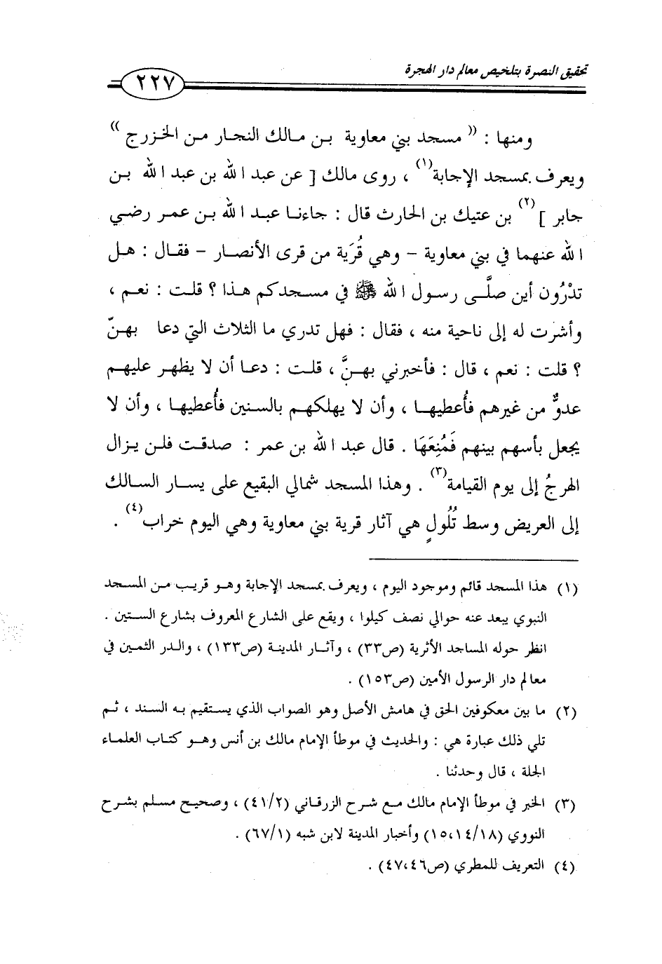 (1) هذا المسجد قائم وموجود اليوم، ويعرف بمسجد الاجابة وهو قريب من المسجد النبوي يبعد عنه حوالي نصف كيلوا، ويقع على الشارع المعروف بشارع الستين.