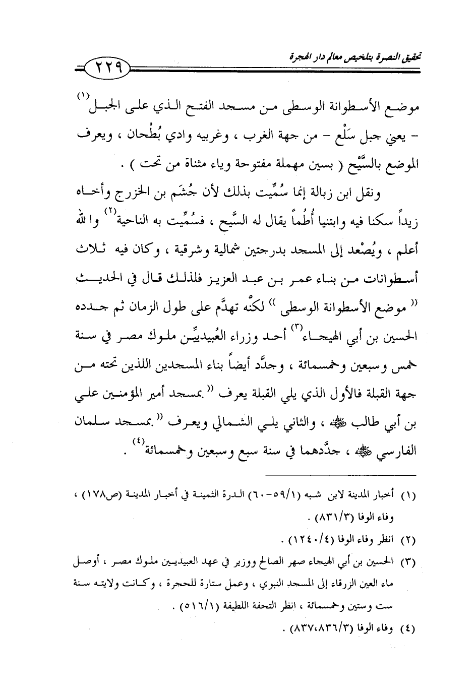 229…موضع الاسطوانة الوسطى من مسجد الفتح الذي على الجبل (1) -يعني جبل سلع- من جهة الغرب، وغربيه وادي بطحان، ويعرف الموضع بالسيح (بسين مهملة مفتوحة وياء مثناة من تحت).