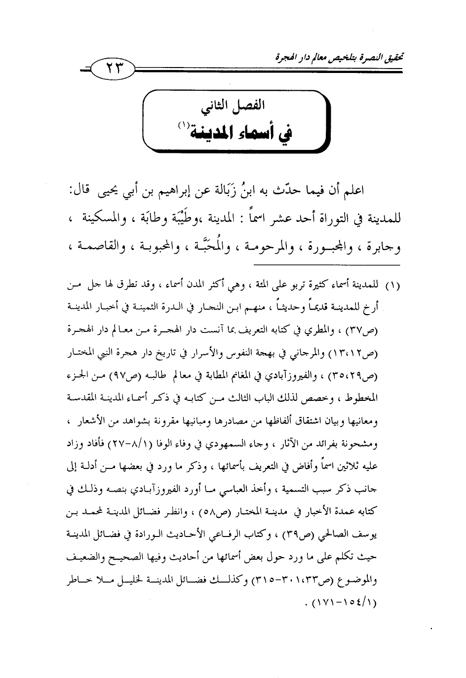 (1) للمدينة اسماء كثيرة تربو على المئة، وهي اكثر المدن اسماء، وقد تطرق لها جل من ارخ للمدينة قديما وحديثا، منهم ابن النجار في الدرة الثمينة في أخبار المدينة (ص37)، والمطري في كتابه التعريف بما آنست دار الهجرة من معالم دار الهجرة (ص13،12) والمرجاني في بهجة النفوس والاسرار في تاريخ دار هجرة النبي المختار (ص35،29) والفيروز آبادي في المغانم المطابة في معالم طالبة (ص97) من الجزء المخطوط، وخصص لذلك الباب الثالث من كتابه في ذكر اسماء المدينة المقدسة ومعانيها وبيان اشتقاق الفاظها من مصادرها ومبانيها مقرونة بشواهد من الاشعار، ومشحونة بفرائد من الاثار، وجاء السمهودي في وفاء الوفا (8/ 1 - 27) فافاد وزاد عليه ثلاثين اسما وافاض في التعريف باسمائها، وذكر ما اورد الفيروز آبادي بنصه وذلك في كتابه عمدة الأخبار في مدينة المختار (ص58)، وانظر فضائل المدينة لمحمد بن يوسف الصالحي (ص39)، وكتاب الرفاعي الاحاديث الواردة في فضائل المدينة حيث تكلم على ما ورد حول بعض اسمائها من احاديث وفيها الصحيح والضعيف والموضوع (ص33، 301 - 315) وكذلك فضائل المدينة لخليل ملا خاطر (154/ 1 - 171).
