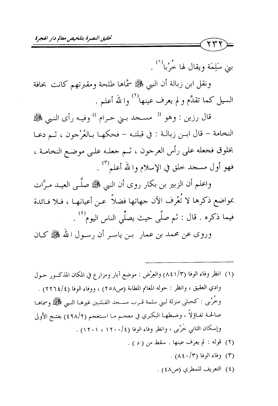 (1) انظر وفاء الوفا (841/ 3) والعرض: موضع ابار ومزارع في المكان المذكور حول وادي العقيق، وانظر: حوله المغانم المطابة (ص258)، ووفاء الوفا (2264/ 4). وخربى: كحبلى منزلة لبني سلمة قرب مسجد القبلتين غيرها النبي صلى الله عليه وسلم وسماها صالحة تفاؤلا، وضبطها اللكري في معجم ما استعجم (498/ 2) بفتح الاولى واسكان الثاني خربى، وانظر وفاء الوفا (1200/ 4، 1201).