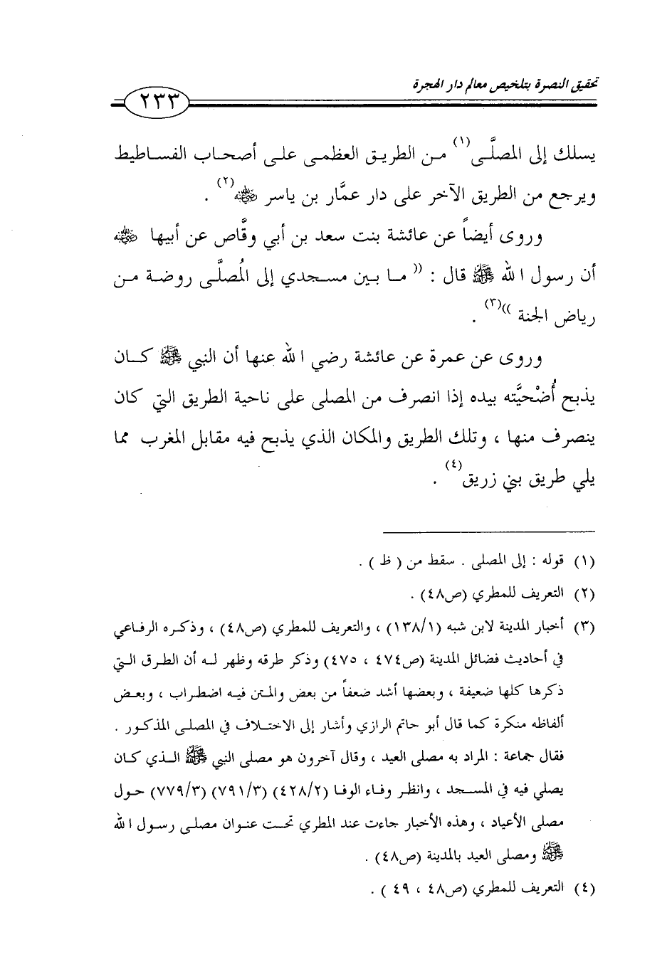 233…يسلك إلى المصلى (1) من الطيق العظمى على اصحاب الفساطيط ويرجع من الطريق الاخر على دار عمار بن ياسر رضي الله عنه (2).