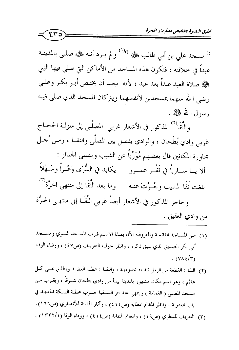 ((مسجد علي بن أبي طالب رضي الله عنه)) (1) ولم يرد انه رضي الله عنه صلى بالمدينة عيدا في خلافته، فتكون هذه المساجد من الاماكن التي صلى فيها النبي صلى الله عليه وسلم صلاة العيد عيدا بعد عيد؛ لانه يبعد ان يختص أبو بكر وعلي رضي الله عنهما بمسجدين لانفسهما ويتركان المسجد الذي صلى فيه رسول الله صلى الله عليه وسلم.