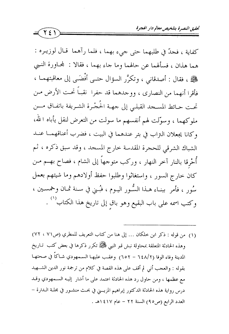 (1) من قوله: ذكر ابن خلكان ... إلى هنا من كتاب التعريف للمطري (ص71، 72) وهذه الحادثة المتعلقة بمحاولة نبش قبر النبي صلى الله عليه وسلم تكرر ذكرها في بعض كتب تاريخ المدينة وفاء الوفا (648/ 2، -652) وعقب عليها السمهودي شاكا في صحتها بقوله: والعجب اني لم اقف على هذه القصة في كلام من ترجمة نور الدين الشهيد مع عظمها، ومن حاول رد هذه الحادثة اعتمد على ما اشار اليه السمهودي وقد درس رواية هذه الحادثة الدكتور ابراهيم المزيني في بحث منشور في مجلة الدارة- العدد الرابع (ص95) السنة 22 - عام 1417هـ.