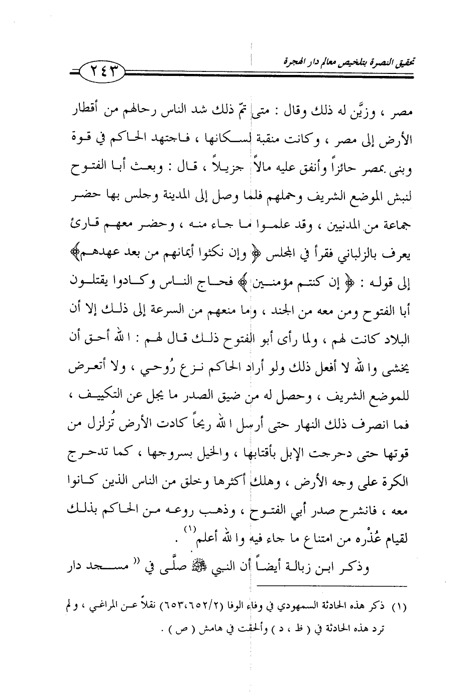 مصر، وزين له ذلك وقال: متى تم ذلك شد الناس رحالهم من أقطار الأرض إلى مصر، وكانت منقبة لسكانها، فاجتهد الحاكم في قوة وبنى بمصر حائراً وأنفق عليه مالاً جزيلاً، قال: وبعث أبا الفتوح لنبش الموضع الشريف وحملهم فلما وصل إلى المدينة وجلس بها حضر جماعة من المدنيين، وقد علموا ما جاء منه، وحضر معهم قارئ يعرف بالزلباني فقرأ في المجلس (وان نكثوا أيمانهم من بعد عهدهم) إلى قوله: (ان كنتم مؤمنبن) فحاج الناس وكادوا يقتلون أبا الفتوح ومن معه من الجند، وما منعهم من السرعة إلى ذلك الا أن البلاد كانت لهم، ولما رأى أبو الفتوح ذلك قال لهم: الله أحق أن يخشى والله لا أفعل ذلك ولو أراد الحاكم نزع روحي، ولا أتعرض للموضع الشريف، وحصل له من ضيق الصدر ما يجل عن التكييف، فما انصرف ذلك النهار حتى أرسل الله ريحاً كادت الأرض تزلزل من قوتها حتى دحرجت الابل بأقتابها، والخيل بسروجها، كما تدحرج الكرة على وجه الأرض، وهلك أكثرها وخلق من الناس الذين كانوا معه، فانشرح صدر أبي الفتوح، وذهب روعه من الحاكم بذلك لقيام عذره من امتناع ما جاء فيه والله أعلم (1).
