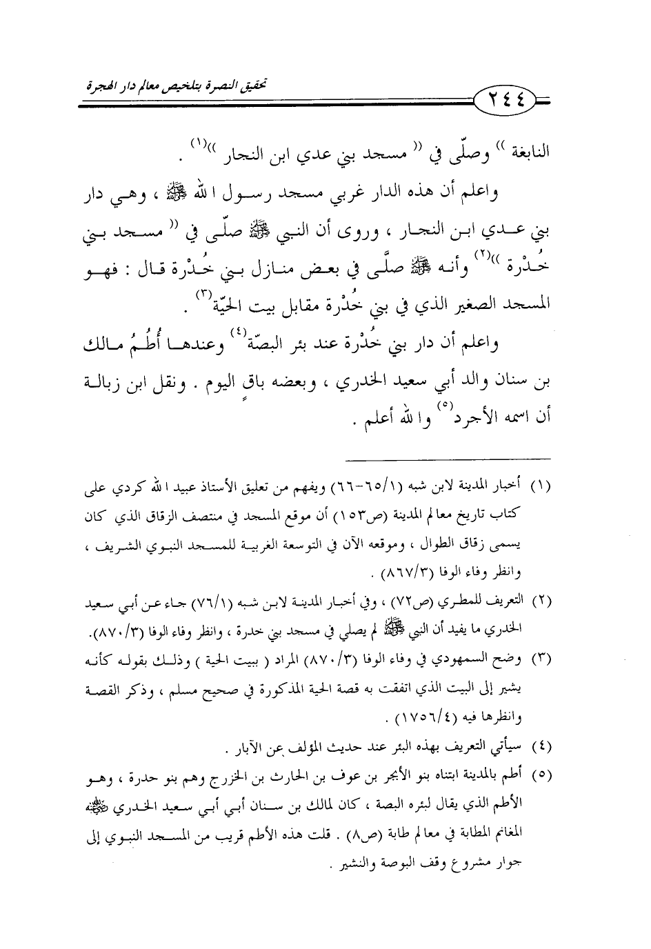 (2) التعريف للمطري (ص 72)، وفي أخبار المدينة لابن شبه (1/ 76) جاء عن أبي سعيد الخدري ما يفيد أن النبي صلى الله عليه وسلم لم يصلي في مسجد بني خدرة، وانظر وفاء الوفا (3/ 870).