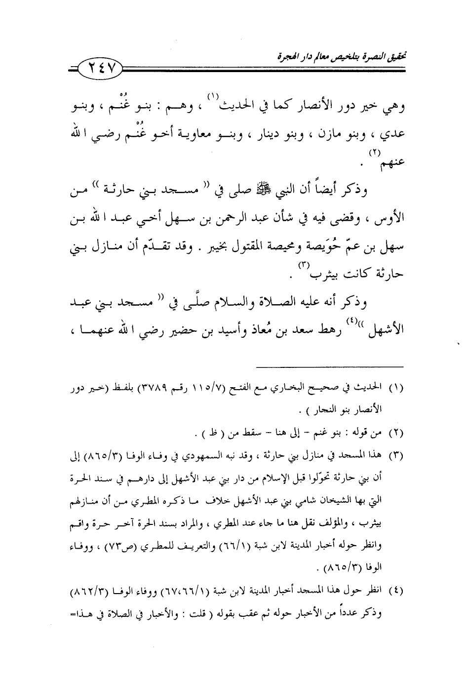 (3) هذا المسجد في منازل بني حارثة، وقد نبه السمهودي في وفاء الوفا (3/ 865) إلى أن بني حارثة تحولوا قبل الاسلام من دار بني عبد الأشهل إلى دارهم في سند الحرة التي بها الشيخان شامي بني عبد الأشهل خلاف ما ذكره المطري من أن منازلهم بيثرب، والمؤلف نقل هنا ما جاء عند المطري، والمراد بسند الحرة آخر حرة واقم وانظر حوله أخبار المدينة لابن شبة (1/ 66) والتعريف للمطري (ص 73)، ووفاء الوفا (3/ 865).