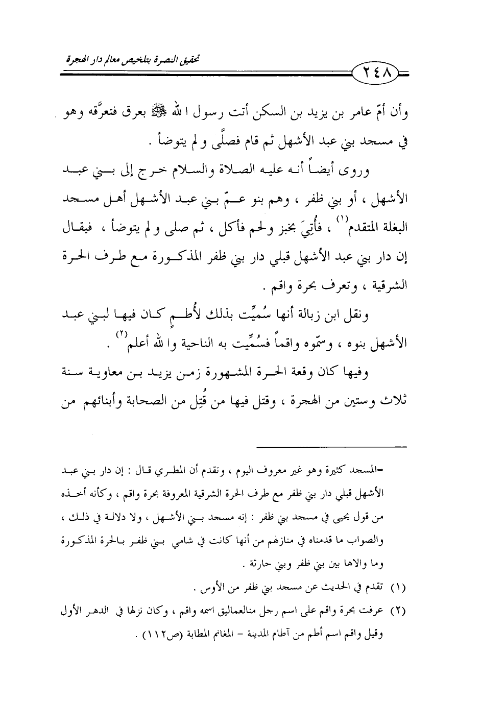 وروى أيضاً أنه عليه الصلاة والسلام خرج إلى بني عبيد الأشهل، أو بني ظفر، وهم بنو عم بني عبد الأشهل أهل مسجد البغلة المتقدم (1)، فأتي بخبز ولحم فأكل، ثم صلى ولم يتوضأ، فيقال ان دار بني عبد الأشهل قبلي دار بني ظفر المذكورة مع طرف الحرة الشرقية، وتعرف بحرة واقم.